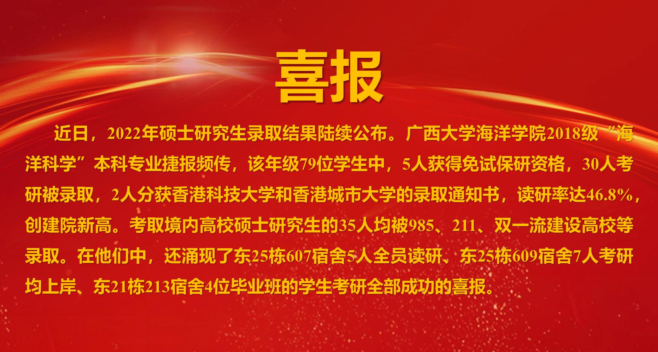 近日,2022年硕士研究生录取结果陆续公布。LETOU国际米兰官网2018级“海洋科学”本科专业捷报频传,该年级79位学生中,5人获得免试保研资格,30人考研被录取,2人分获香港科技大学和香港城市大学的录取通知书,读研率达46.8%,创建院新高。考取境内高校硕士研究生的35人均被985、211、双一流建设高校等录取。在他们中,还涌现了东25栋607宿舍5人全员读研、东25栋609宿舍7人考研均上岸、东21栋213宿舍4位毕业班的学生考研全部成功的喜报。