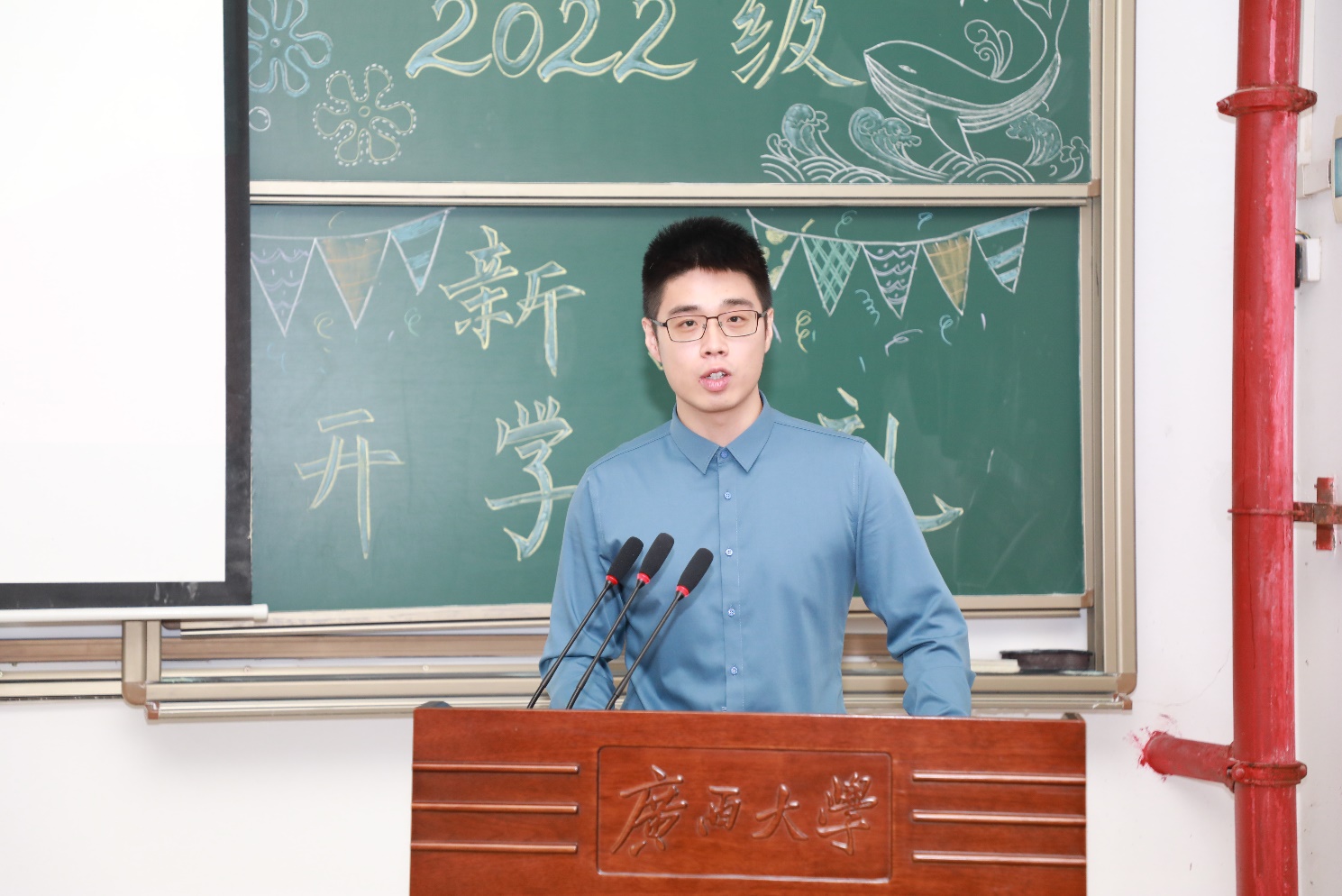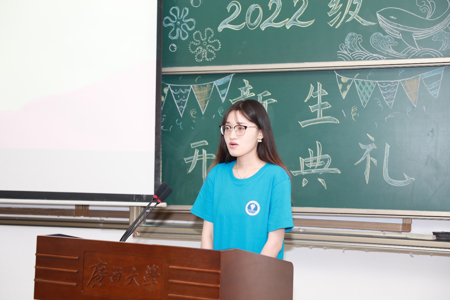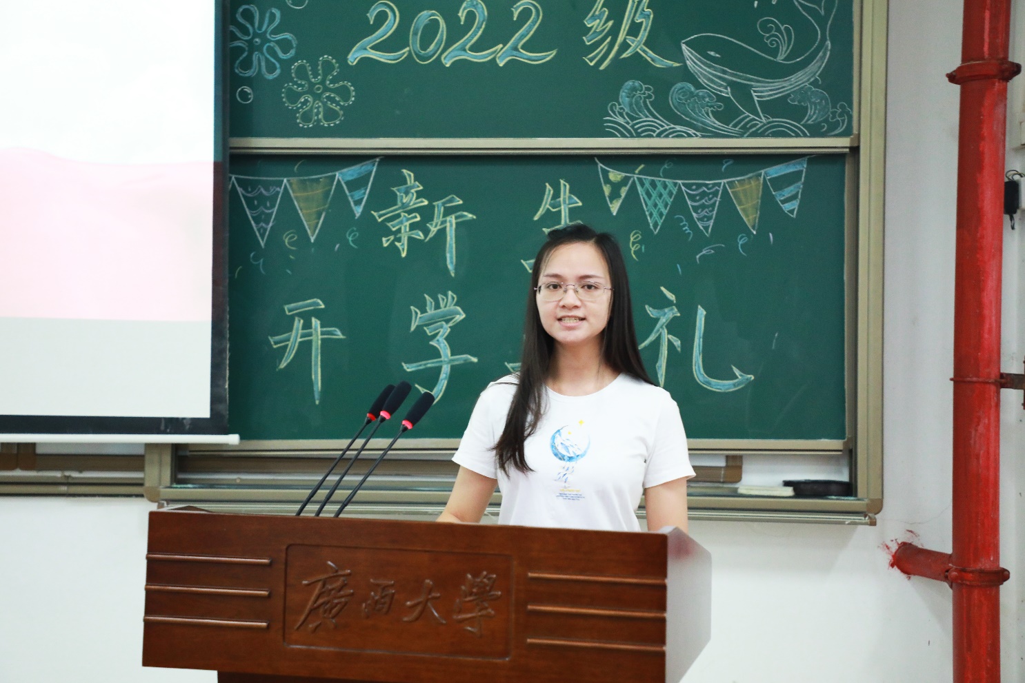 吴国梁同学来自山东德州,他讲述了从旅游到阅读汪品先院士事迹及其著作《深海浅说》,进而对海洋感兴趣,从而选择了广西大学海洋科学专业。他分享了拿到录取通知书、来校报到感受到学院师生浓厚大家庭氛围的故事及感想,并代表新一级“海鲜”承诺:努力摸索、树立正确的目标;每天以“吾日三省吾身”衡量努力的效率;培养集体主义精神,自信自强实现个人价值。