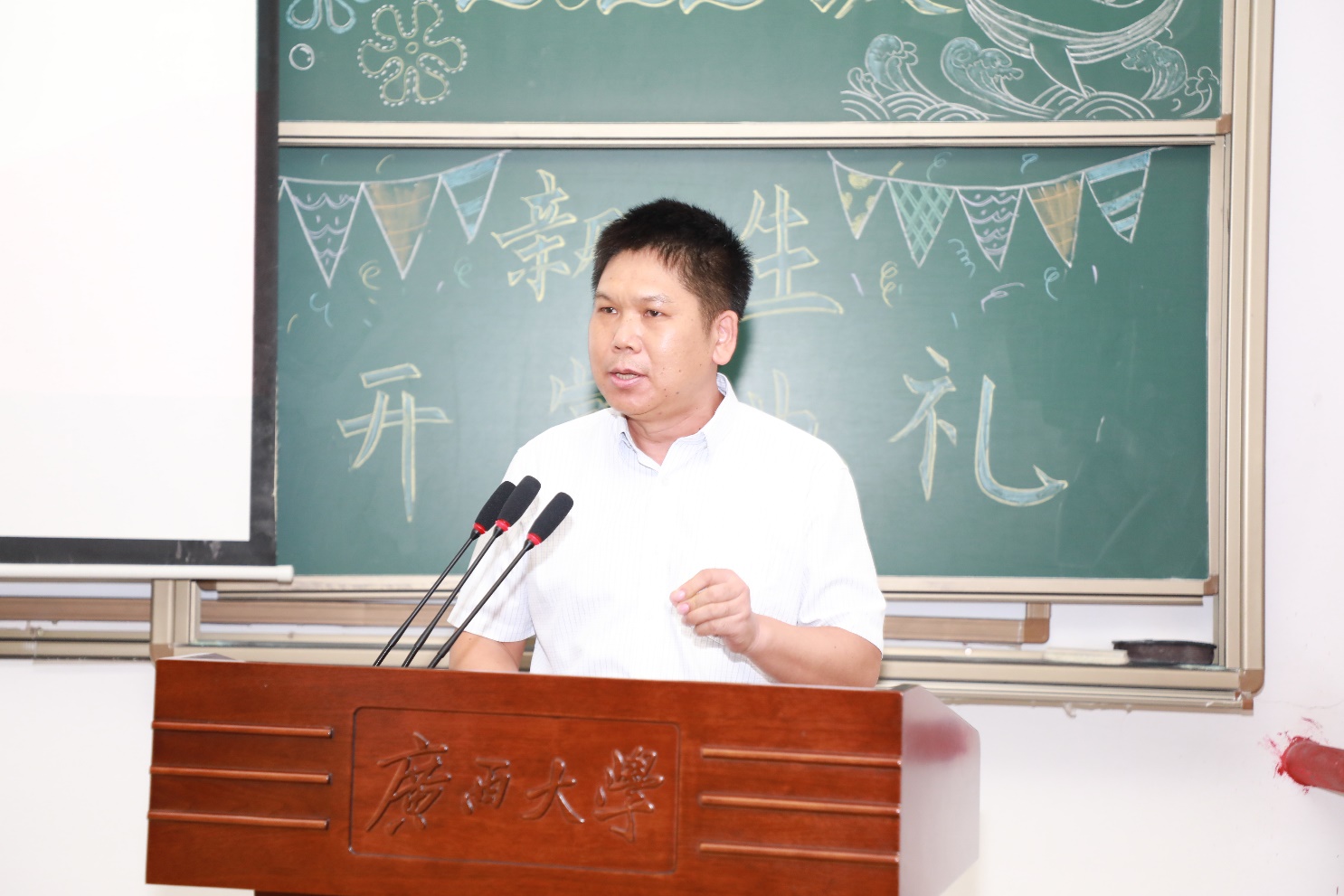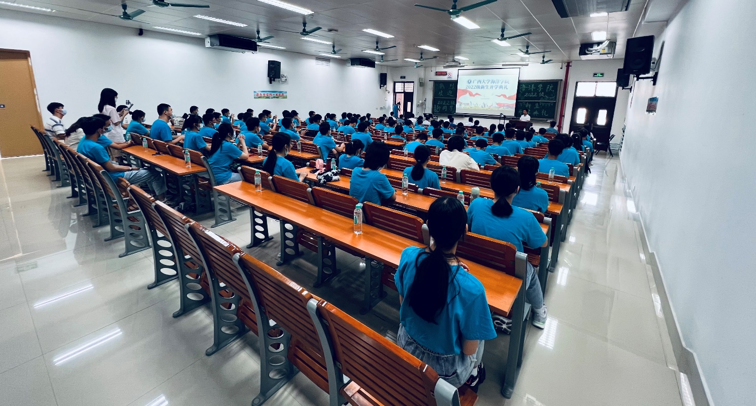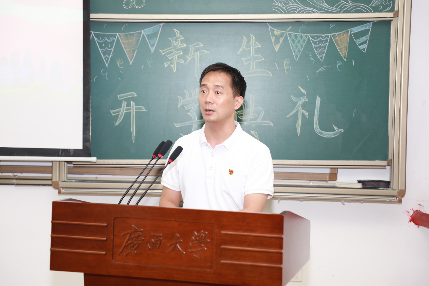 吴国梁同学来自山东德州,他讲述了从旅游到阅读汪品先院士事迹及其著作《深海浅说》,进而对海洋感兴趣,从而选择了广西大学海洋科学专业。他分享了拿到录取通知书、来校报到感受到学院师生浓厚大家庭氛围的故事及感想,并代表新一级“海鲜”承诺:努力摸索、树立正确的目标;每天以“吾日三省吾身”衡量努力的效率;培养集体主义精神,自信自强实现个人价值。