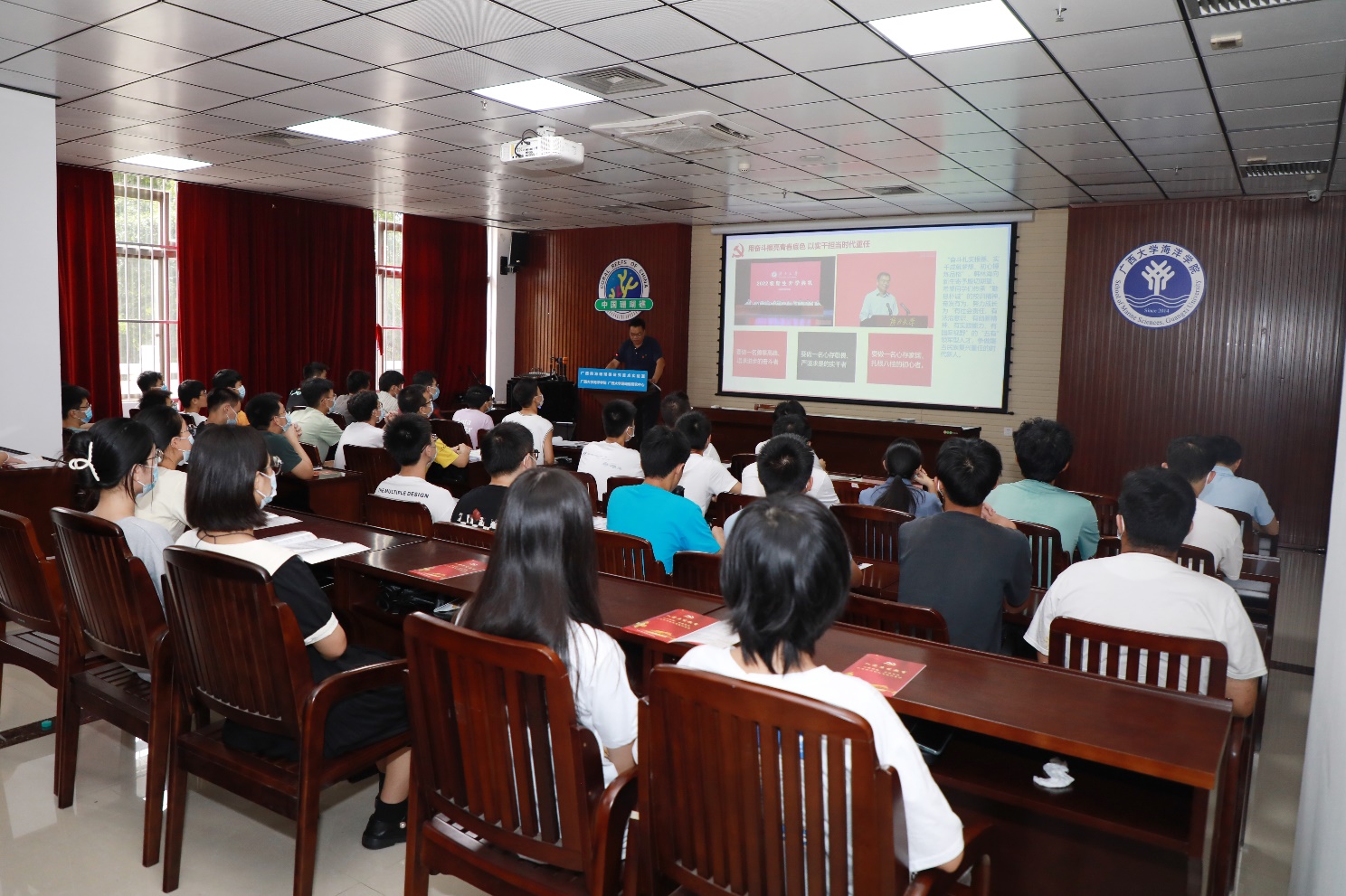 会上,党委书记谭运阳开展了《让青春在奋斗中闪光》为主题的党课。他首先阐述了奋斗是时代永恒的主题,永久奋斗是中国青年的优良传统,他以蔡和森、邓稼先、陈薇、黄文秀等共产党员的先进事迹为例讲述了一代代青年积极投身革命、建设、改革事业,谱写中华民族伟大复兴进程中激昂的青春乐章;其次,他分析了中国青年愿意追随着我们党的事业是因为我们党是全心全意为人民服务的政党,是为实现理想不懈奋斗的政党,是具有强大领导力和执政力的政党,是始终保持旺盛生机和活力的政党,是为人类和平与发展贡献力量的政党;再次,他提出希望,大学生要让奋斗的青春在党旗下闪光;最后,他告诉同学们怎样才能加入中国共产党。
