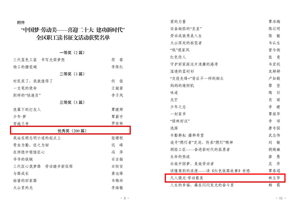 近日,自治区总工会办公室公布了“中国梦·劳动美——喜迎二十大 建功新时代”全区职工读书征文活动获奖名单,LETOU官网林玉华老师榜上有名,其作品从2700多篇参赛作品中脱颖而出,喜获优秀奖,是我校两位获奖者之一。