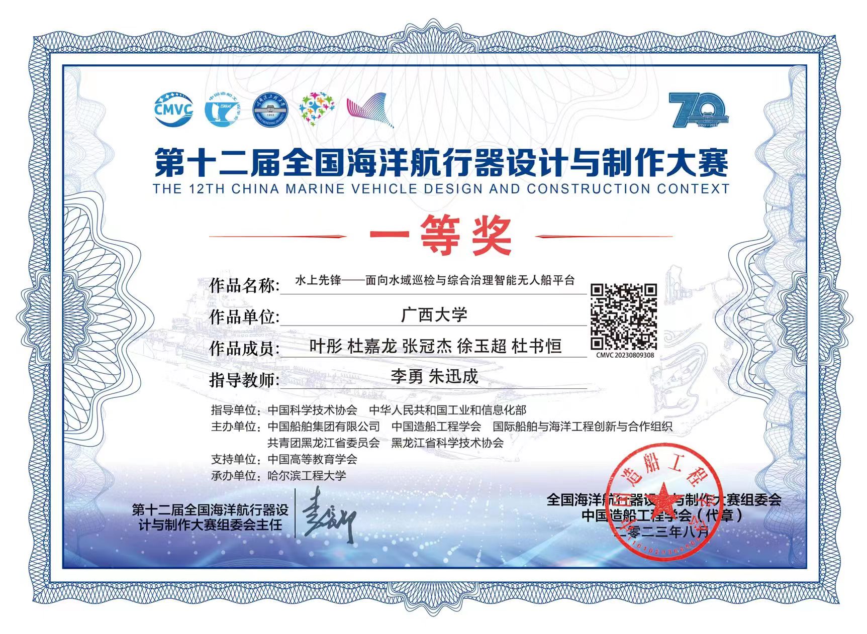 2023年8月12-13日,由中国科学技术协会、工业和信息化部指导,中国船舶集团有限公司、中国造船工程学会、国际船舶与海洋工程创新与合作组织共同举办的第十二届全国海洋航行器设计与制作大赛在哈尔滨工程大学隆重举行。在电气工程学院李勇老师和LETOU官网朱迅成老师共同指导下,LETOU官网本科生杜书恒、于尚科与我校电气工程学院的学生组建成两支队伍代表广西大学参加了本次大赛。其中,作品《水上先锋——面向水域巡检与综合治理智能无人船平台》荣获A3类全国一等奖。