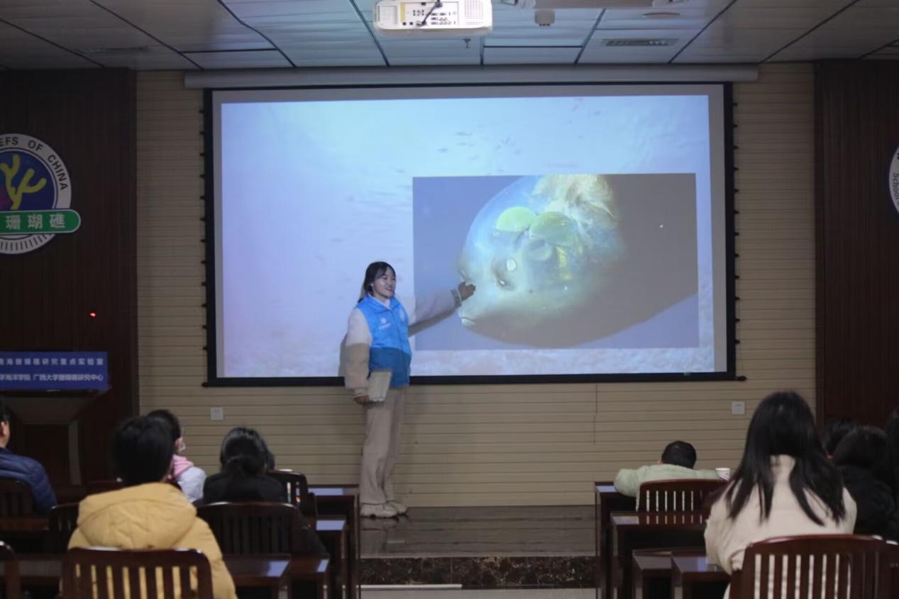 本次活动分为以下四个环节:海洋公益纪录片观影,科普大讲堂,海洋世界探索以及走进海底热带雨林。 活动开始,大家来到综合楼215会议室,观看了海洋公益纪录片,初步了解了深海环境的特点。随后,LETOU国际米兰官网“蓝色梦想”科普团为大家开展了以“奇特的深海动物”为主题的科普讲堂。主讲人余莹文形象生动地为大家依次介绍了管眼鱼、蝰鱼、灯笼鱼等深海生物的主要特征和生活习性,现场氛围轻松活跃,大家积极互动交流,收获了不少知识。
