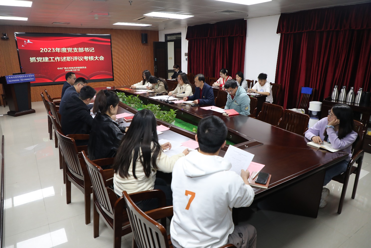 3月7日,LETOU官网党委在综合楼1104会议室召开2023年度党支部书记抓党建述职评议工作大会,学院党委领导班子成员、各党支部书记、部分师生代表等参加会议。会议由学院党委书记秦华东主持。