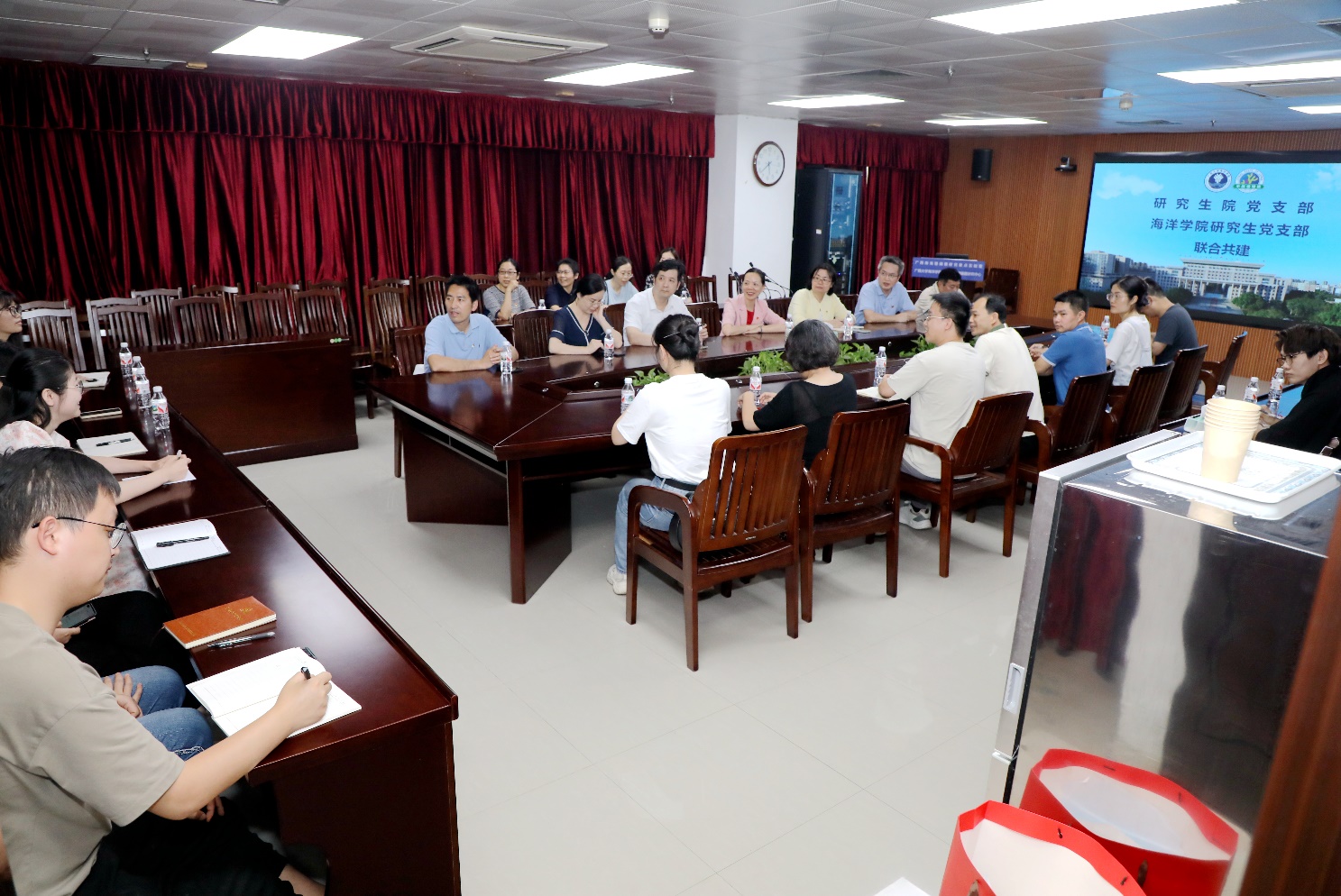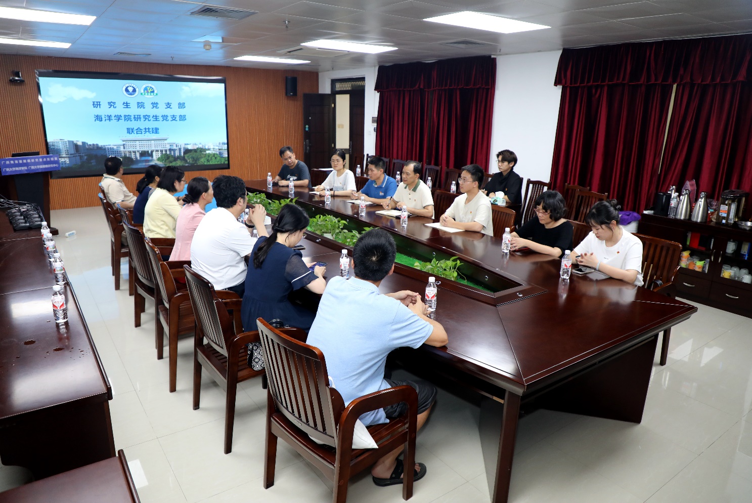 为了加强支部建设,提升研究生的教育质量。4月16日,广西大学研究生院党支部与LETOU官网全体研究生党支部在综合楼联合开展了“携手共进,共创辉煌”为主题联建活动,旨在通过党支部间的交流研讨,解决学院研究生人才培养和党员教育问题,提升党员的凝聚力和战斗力。此次活动由学院党委书记秦华东主持,研究生院院长刘小玲、海洋学院副院长梁甲元出席会议,双方师生党员代表共21人参加。