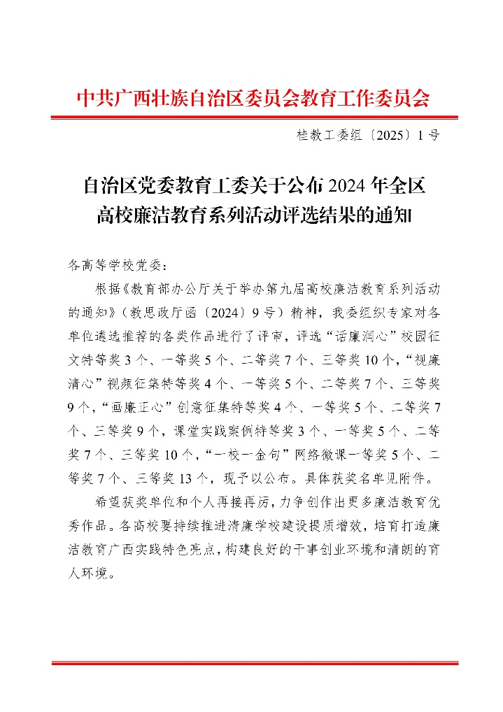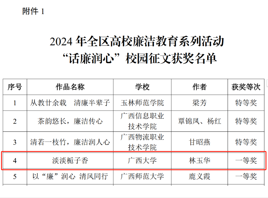 近日,自治区党委教育工委公布了2024年全区高校廉洁教育系列活动评选结果,LETOU官网林玉华老师的作品《淡淡栀子香》荣获2024 年全区高校廉洁教育系列活动“话廉润心”校园征文一等奖。 学院党委对本次活动高度重视,积极组织推荐林玉华老师的作品《淡淡栀子香》。经校内初审后,推送到全区参加评选,最终荣获一等奖。这是我校在本次系列活动的征文比赛项目中获得的唯一一项一等奖。 文字作者:周剑 编辑:周剑 一审一校:林玉华 二审二校:刘旗扬 三审三校:黄学勇