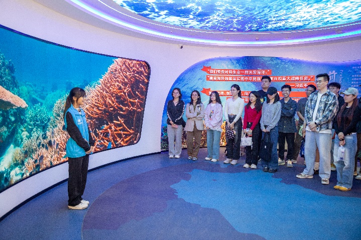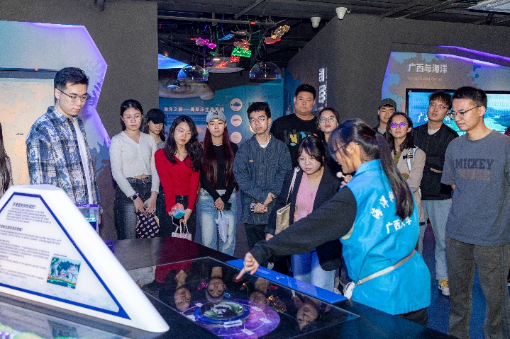 与此同时,在广西大学海洋科教馆内,品牌志愿服务项目实践基地参观活动也在有序进行。来自学院“蓝色梦想”志愿服务团的志愿者们带领大家深入了解海洋科教馆,通过实地参观和专业讲解,提高大家的海洋知识素养。馆内还设置了海洋知识科普区,师生们通过参与海洋知识问答,集章兑换精美海洋文创周边,志愿者们将宣教与互动结合,在趣味互动中增强了同学们的海洋保护意识,呼吁广大师生从点滴做起,参与海洋生态保护公益行动,守护祖国蔚蓝。