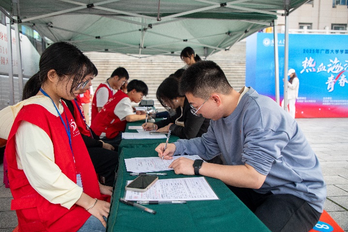 场地周边还设有血液知识科普区,南宁市中心血站工作人员结合“百发百中”投壶游戏和“知识问答大富翁”等互动活动,让大家在轻松愉快的氛围中学习到无偿献血的相关知识,更深入了解了无偿献血的重要意义。许多师生“闯关成功”并在活动海报展板合影,定格珍藏参与志愿服务活动的喜悦。