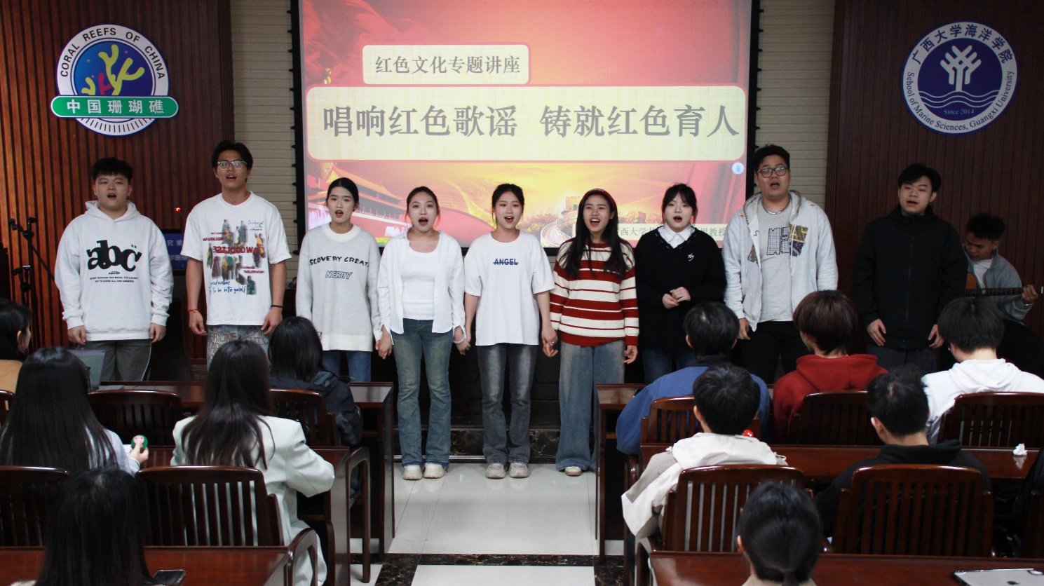 讲座尾声,艺术学院的同学们带来了精心准备的曲目演唱《卢沟谣》和《我爱你中国》。激昂的旋律、深情的演绎,将现场气氛推向高潮,同学们深受感染,掌声经久不息。对于肩负探索深蓝奥秘使命的海洋学子而言,这场思想与视听的双重盛宴具有特殊意义。当红色歌谣中淬炼出的忠诚信念与向海图强的时代命题相遇,激发出的是双重维度的精神觉醒。