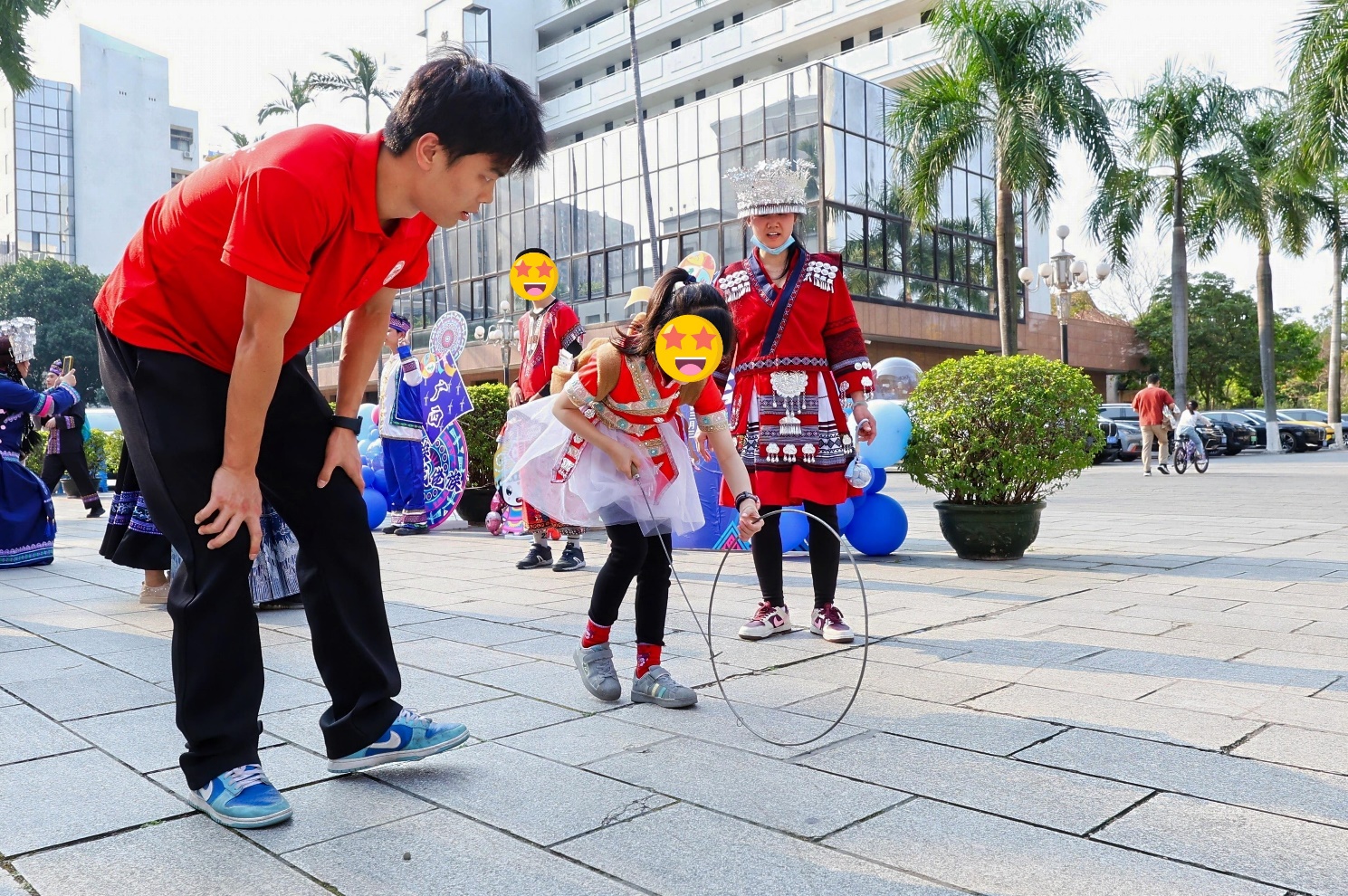 恰逢壮族传统节日“三月三”,研学活动特别融入了民族文化元素。本次活动邀请到体育学院“接力棒”志愿服务组织为孩子们精心设置了“三月三”民族运动体验,孩子们在志愿者的引导下参与滚铁环、打陀螺、高杆绣球等民族游戏,现场欢乐轻松的氛围为孩子们创造了低压力社交环境。