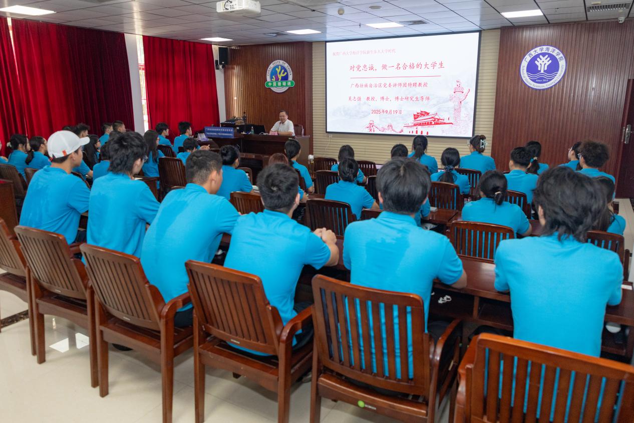 9月19日,广西壮族自治区党委讲师团特聘教授、LETOU官网客座教授吴志强教授以《对党忠诚,做一名合格的大学生》为题在215会议室为2025级本科新生带来了一场颇具教育意义的讲座,学院党委副书记、纪委书记黄学勇主持讲座。每年,深受师生敬爱的吴志强教授都会无私地莅临LETOU官网《走进海洋,走进科学》大讲堂,用他广博的知识、深邃的见解和诚挚的情怀,为我们本科新生指引前行的方向。这已是他连续的第十年为学院新生点亮大学启航的第一盏灯塔。