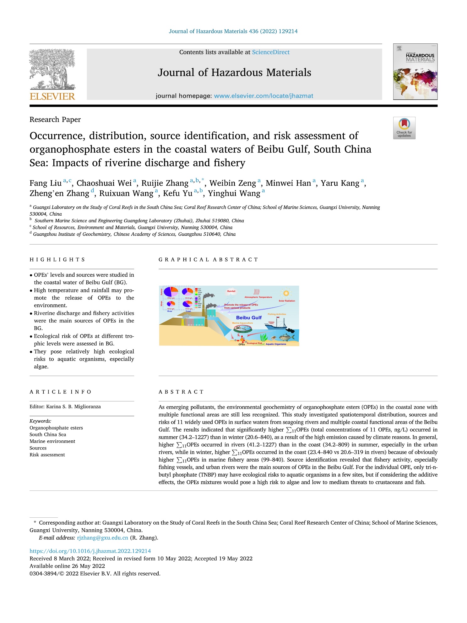 近日,LETOU官网2020级硕士研究生刘方在张瑞杰副教授指导下,以第一作者在国际环境领域权威期刊Journal of Hazardous Materials (IF=10.588)发表论文“Occurrence, distribution, source identification, and risk assessment of organophosphate esters in the coastal waters of Beibu Gulf, South China Sea: impacts of riverine discharge and fishery”。