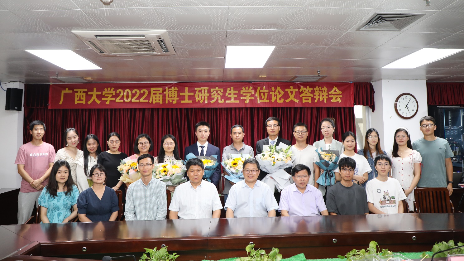 参加答辩的博士研究生与答辩主席、答辩委员、部分在读研究生们合影留念