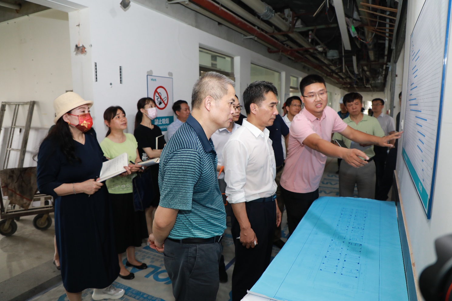 王少鹏副院长(前排右一)向王乃学书记(前排中)一行介绍工程综合情况