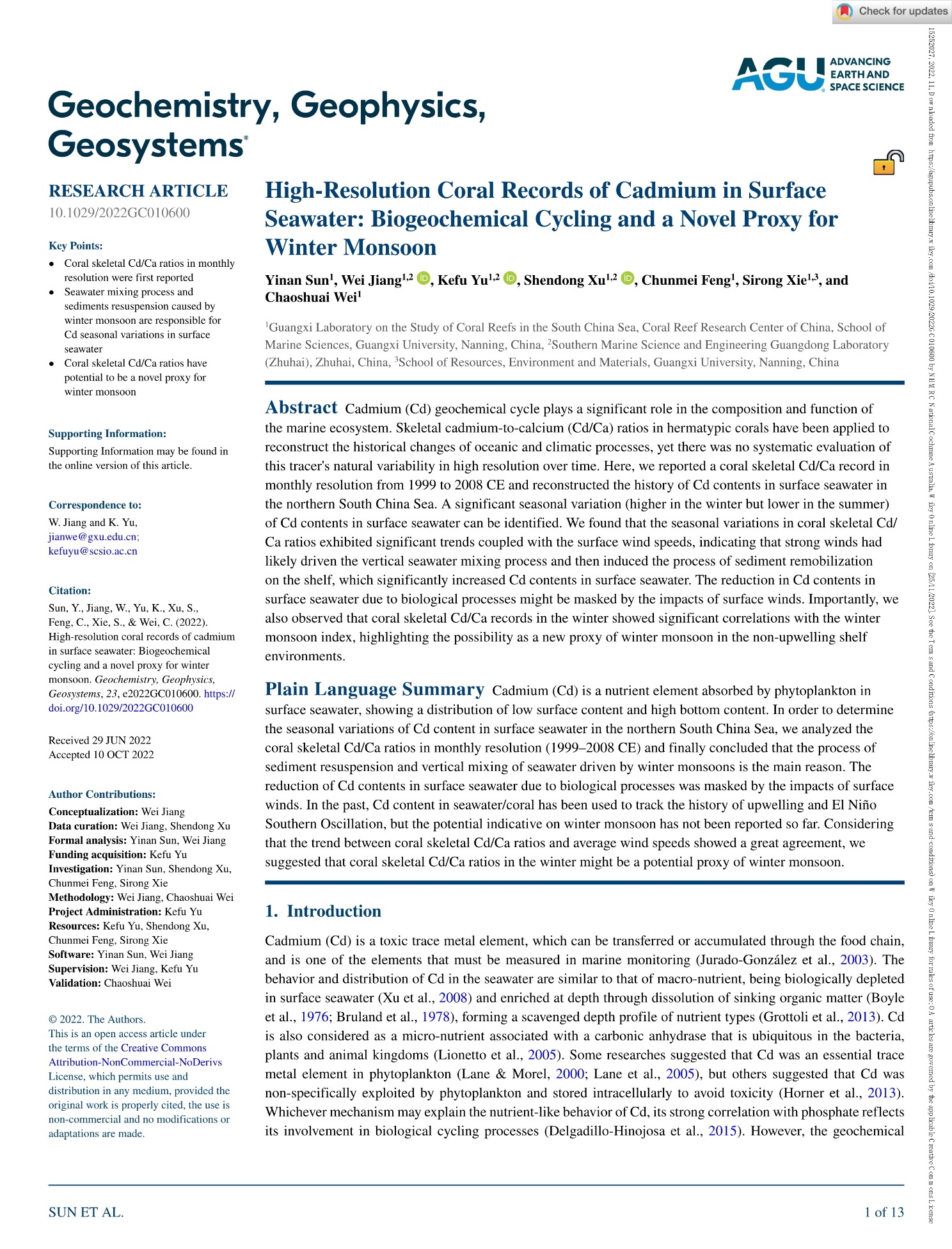 Sun, Y., Jiang, W., Yu, K., Xu, S., Feng, C., Xie, S., & Wei, C. (2022). High-resolution coral records of cadmium in surface seawater: Biogeochemical cycling and a novel proxy for winter monsoon. Geochemistry, Geophysics, Geosystems, 23, e2022GC010600. https://doi.org/10.1029/2022GC010600