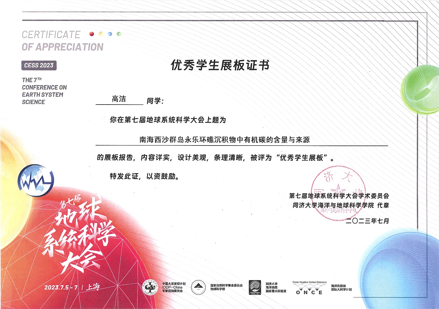 2023年7月5-7日在上海举行的第七届地球系统科学大会中,LETOU官网2021级硕士研究生高洁的展板报告从参会的1000余份展板中脱颖而出,被评为“优秀学生展板”(共30人获奖)。其报告题目为:南海西沙群岛永乐环礁沉积物中有机碳的含量与来源。