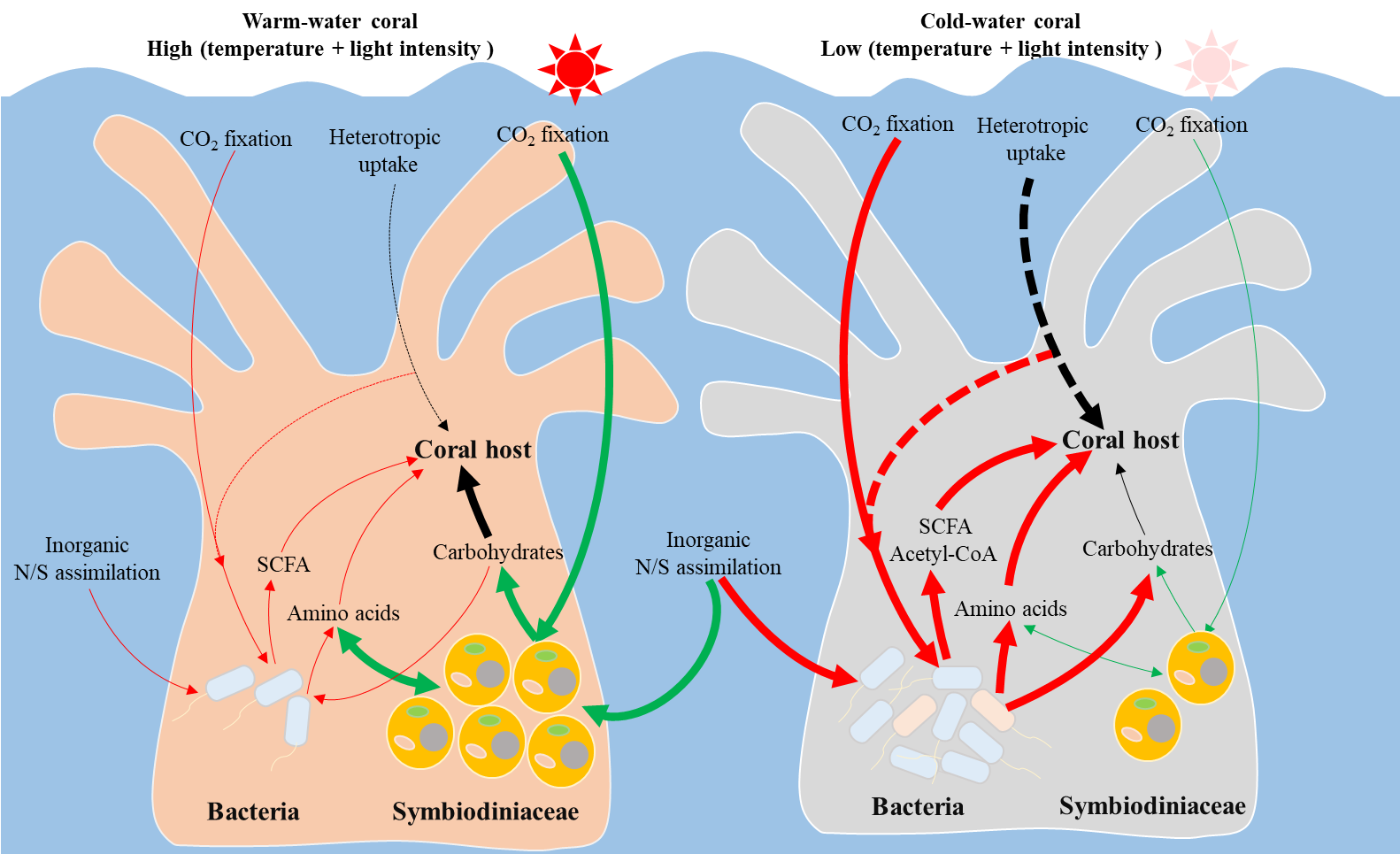 该研究拓展了人们对共生虫黄藻分布范围的认识,发现虫黄藻可以生存于370m水深的冷水珊瑚中。该研究提示细菌可能在冷水珊瑚适应弱光低温的深水生境中扮演重要角色,包括通过非光合碳固定途径为宿主提供有机碳来源等。该研究为进一步深入解析深水生境中珊瑚共生体共生机制及其环境适应机理奠定了基础。
