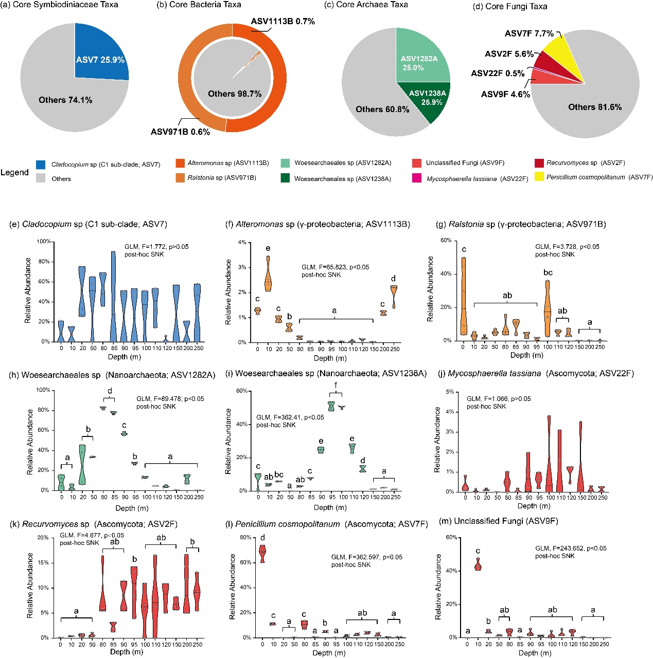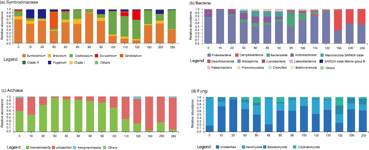 (3)三沙永乐龙洞水体的核心微生物群由虫黄藻(Cladocopium)、细菌(Alteromonas、Ralstonia)、古菌(Woesearchaeales)以及真菌(Mycosphaerella tassiana、Recurvomyces、Penicillium cosmopolitanum)共同组成,其稳定存在于跨越富氧层、化变层与深水厌氧层14个深度剖面的水体环境中。微生物进化、环境驯化以及共生体系构建是驱动核心微生物群具备极端环境适应能力的关键要素。