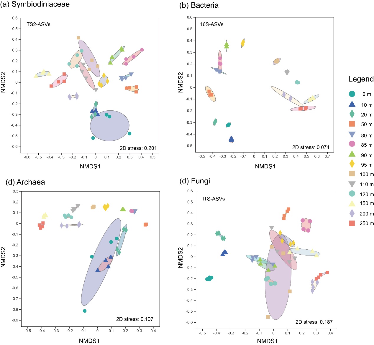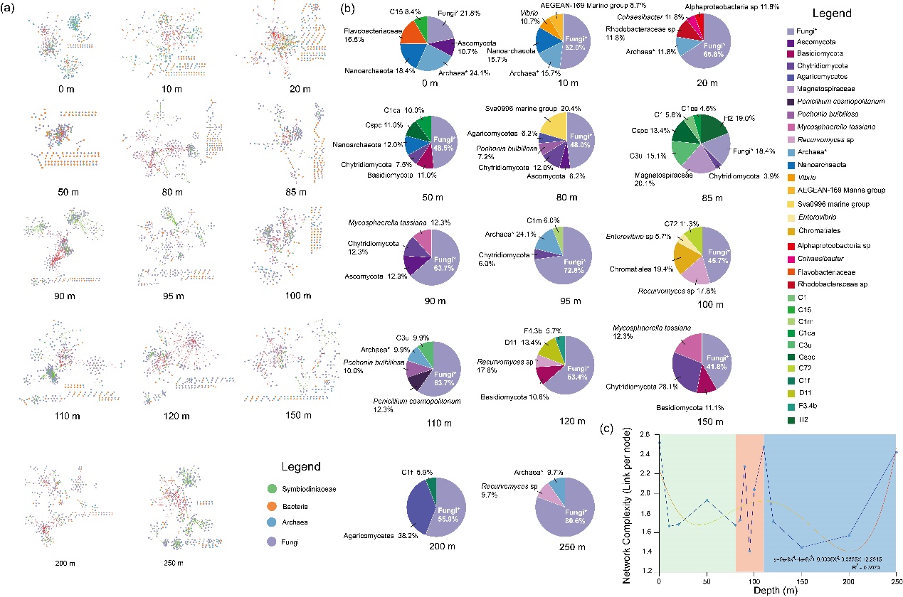 (4)三沙永乐龙洞水体中的微生物存在活跃的交互作用,但其交互作用网络则主要由真菌驱动。龙洞水体微生物互作网络的复杂度在富氧层表面(0m)、化变层底部(110m)以及深水厌氧层底部达到峰值(250m)。该结果指示了三沙永乐龙洞不同水层交界面环境因子的突变与耦合作用是水体微生物互作与生命活动的主要驱动因素。