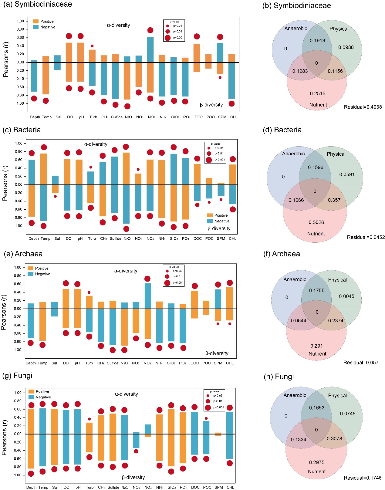 (1)虫黄藻广泛分布于三沙永乐龙洞中的富氧层(0-80m)、化变层(80-115m)以及深水厌氧层(115-300.89m)的水体环境中,其α多样性与古菌存在显著的正相关关系。由于虫黄藻与古菌存在部分生态位重叠,因此虫黄藻在无光、低溶解氧等极端环境下的生命活动依赖于具有共生潜能的古菌(Nanoarchaeota与Aenigmarchaeota)。