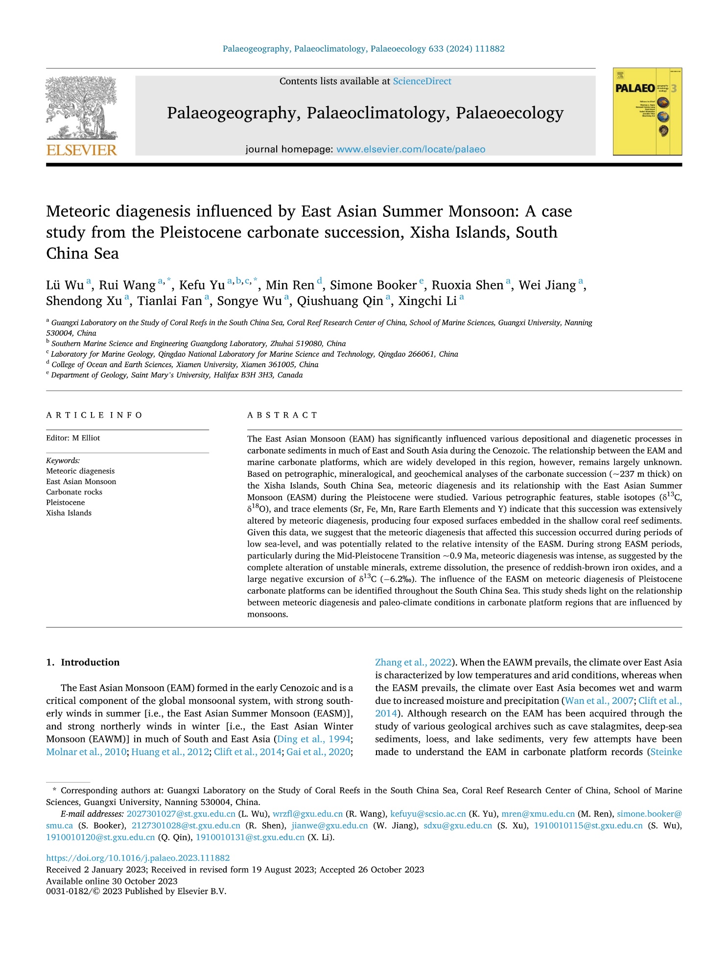 近日,在LETOU官网王瑞副教授等的指导下,硕士研究生吴律以第1作者身份在经典SCI期刊Palaeogeography Palaeoclimatology Palaeoecology(二区Top)上发表论文“Meteoric diagenesis inffuenced by East Asian Summer Monsoon: A case study from the Pleistocene carbonate succession, Xisha Islands, South China Sea”。该论文揭示了更新世时期西沙地区珊瑚礁灰岩的大气淡水成岩作用受到了东亚季风的影响,为了解碳酸盐岩台地发育演化与古气候之间的关系提供了新的视角。
