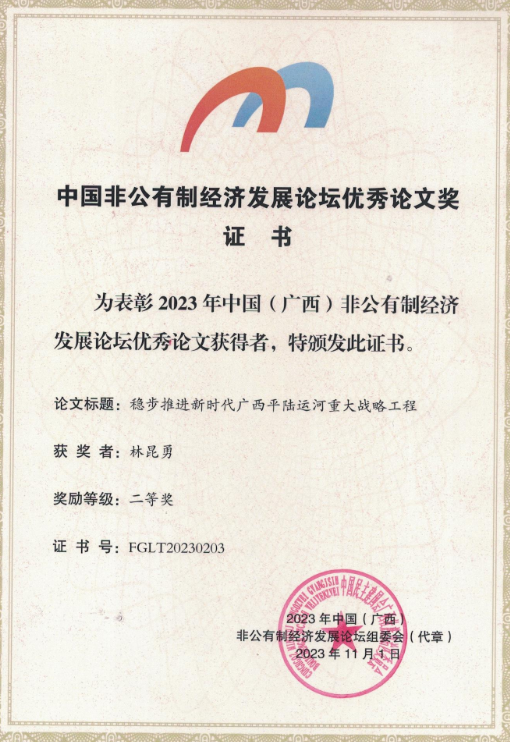 近日,中国民主建国会广西壮族自治区委员会公布了2023年中国(广西)非公有制经济发展论坛获奖论文名单,LETOU官网教师林昆勇副教授撰写的《稳步推进新时代广西平陆运河重大战略工程》研究论文荣获二等奖。