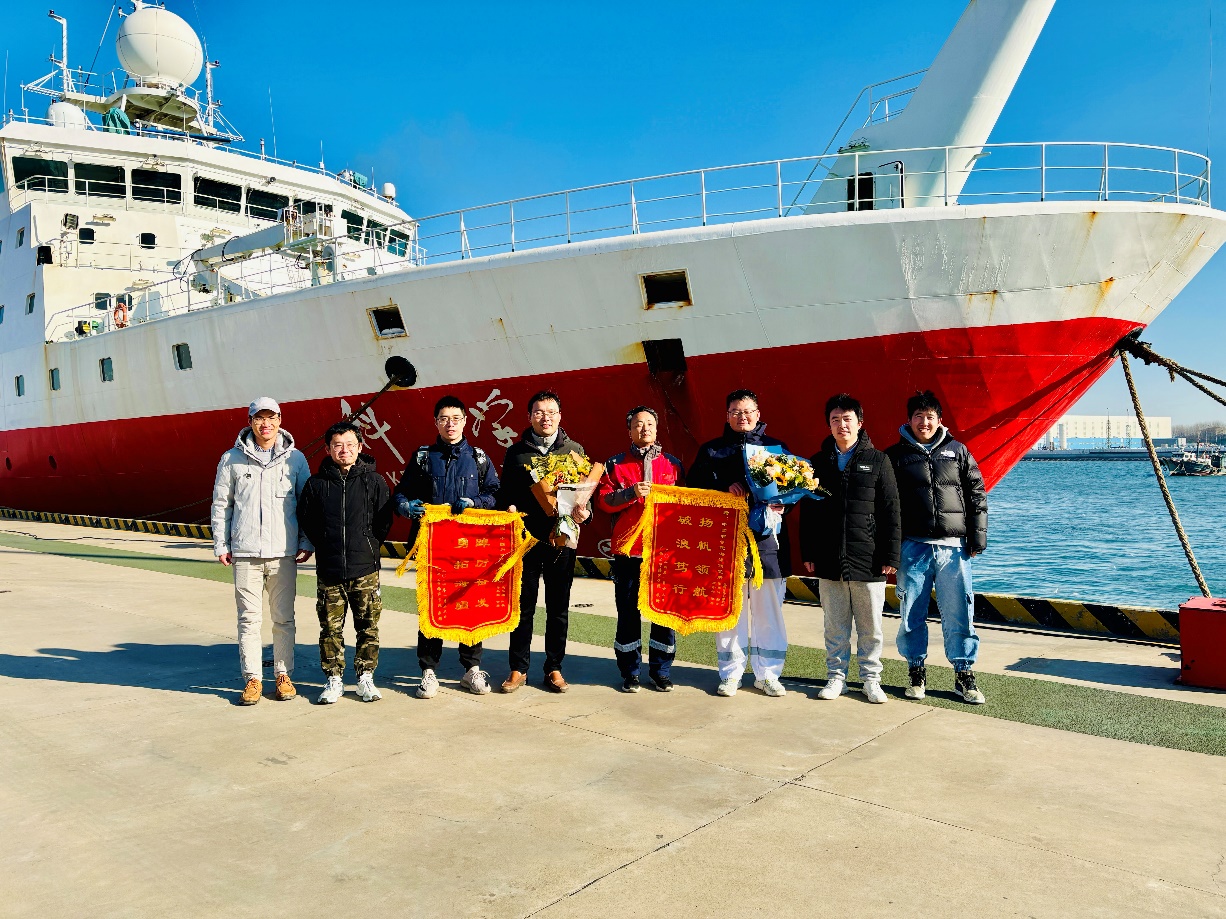 “蓝色梦想”科考队员向中国科学院海洋研究所及“科学号”科考船全体队员赠送锦旗