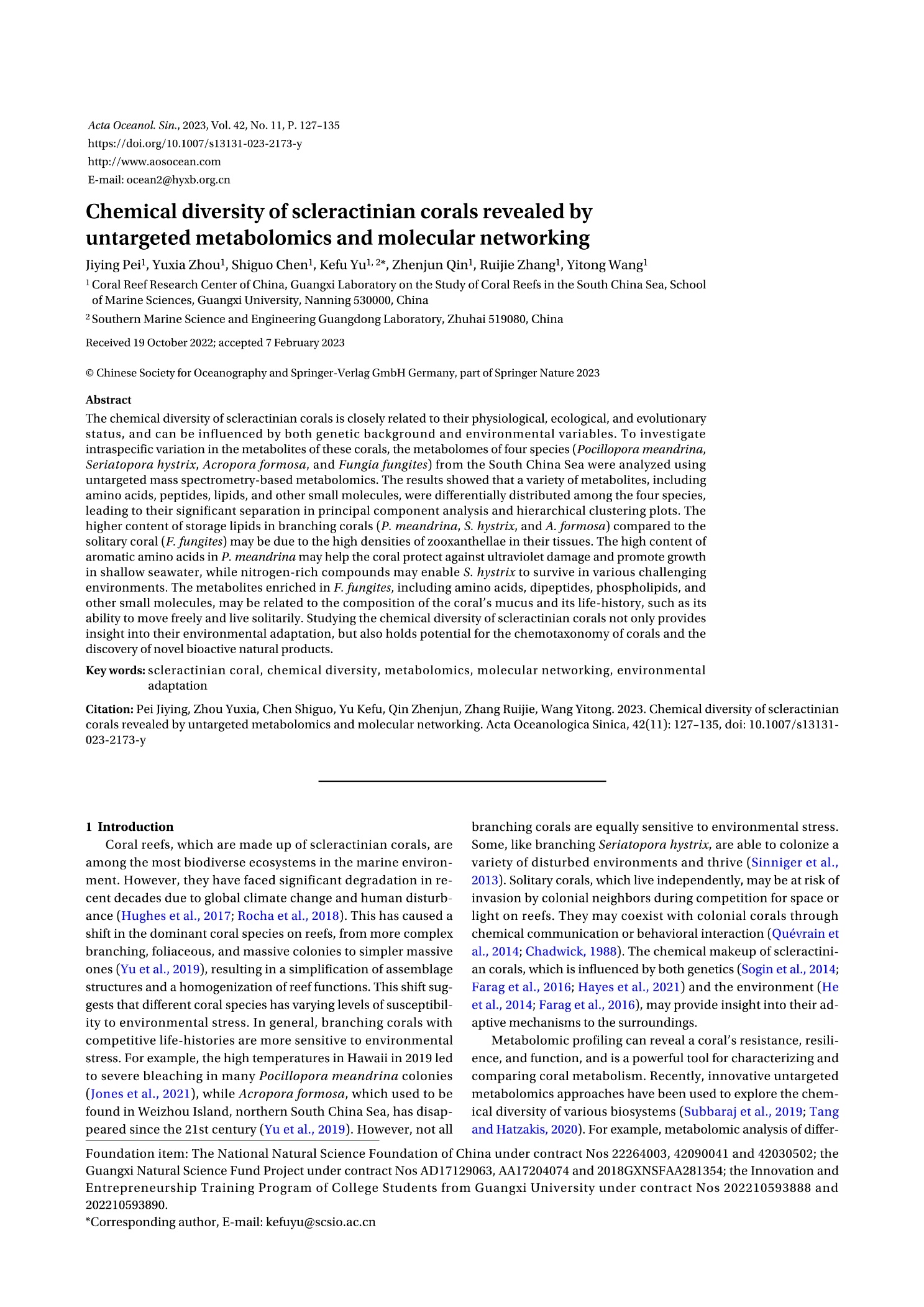 Pei Jiying, Zhou Yuxia, Chen Shiguo, Yu Kefu, Qin Zhenjun, Zhang Ruijie, Wang Yitong. 2024. Chemical diversity of scleractinian corals revealed by untargeted metabolomics and molecular networking. Acta Oceanologica Sinica, 2023, 42(11): 127-135. doi: 10.1007/s13131-023-2173-y.