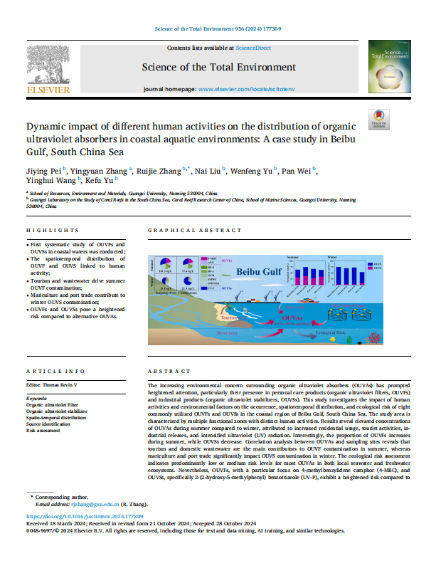 Pei Jiying, Zhang Yingyuan, Zhang Ruijie, Liu Nai, Yu Wenfeng, Wei Pan, Wang Yinghui, Yu Kefu. 2024. Dynamic impact of different human activities on the distribution of organic ultraviolet absorbers in coastal aquatic environments: A case study in Beibu Gulf, South China Sea. Science of the Total environment 956, 177309. https://doi.org/10.1016/j.scitotenv.2024.177309.