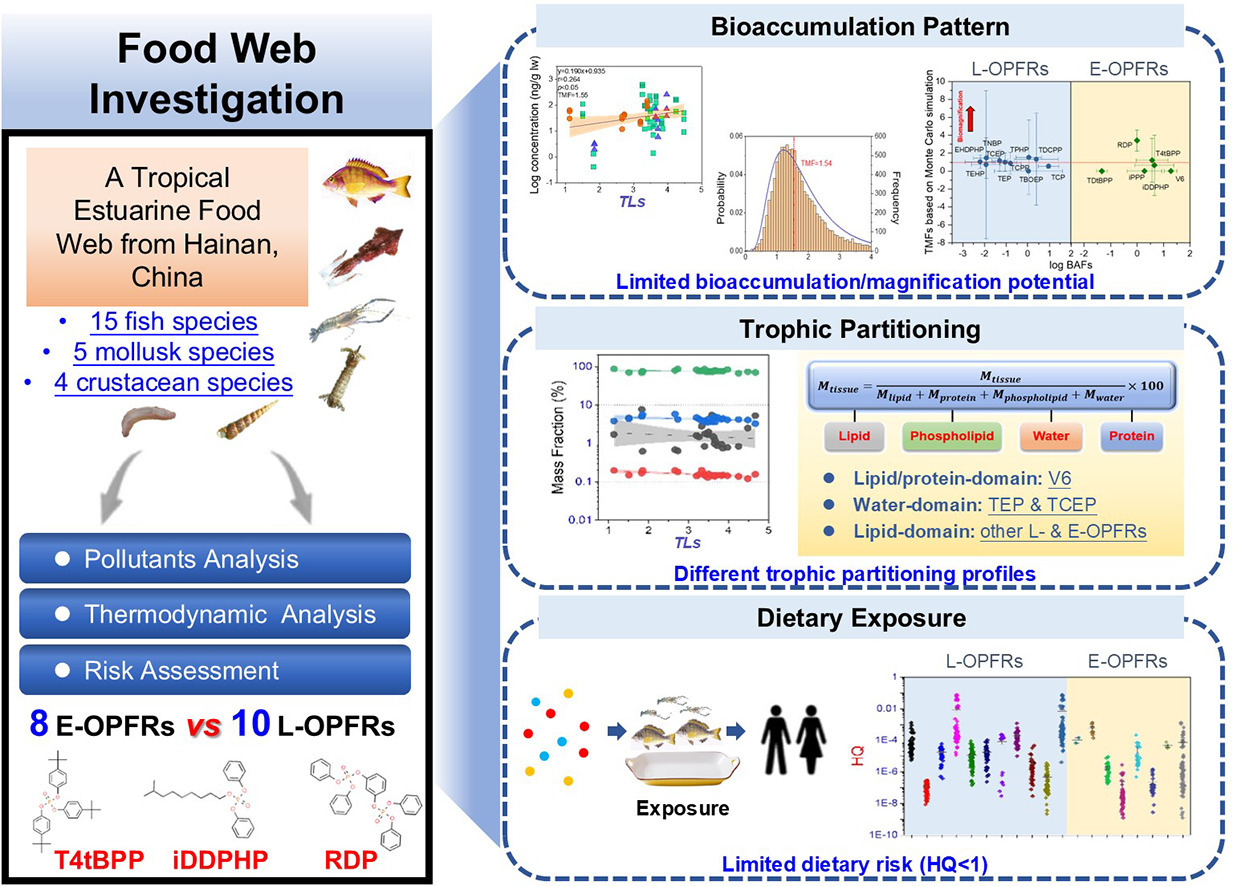 研究以海南南渡江河口24种常见海洋经济物种为研究对象,分析了其体内8种新型OPFRs和10种传统OPFRs的赋存分布特征,探究了新型和传统OPFRs在不同生物组织的分配能力差异,深入探讨了化合物物理化学特性和生物生化参数对目标化合物物种差异化富集的机制。结果表明,新、旧OPFRs在南渡江河口经济物种体内浓度存在显著差异:传统OPFRs浓度(16.1-1.18×105 ng/g脂重)明显高于新型OPFRs(未检出-2.82×103 ng/g脂重)。在所研究的生物体内,新、旧OPFRs的水平都表现出相似的趋势:鱼类<软体动物<甲壳类动物。三(苯基)磷酸酯(TPHP,一种传统OPFRs)的营养放大因子(TMF)为1.55,具有显著的生物放大特性,而其他新型OPFRs的营养转移潜力有限。基于多参数线性自由能模型并结合食物网中各物种的吸附相实际组成情况计算了OPFRs在各物种中的分配模式,结果发现脂质是大多数新型OPFRs和传统OPFRs的主要吸附相。通过代谢产物的定量分析以及化合物生物转化率(KM)的估算结果发现,大多数传统OPFRs的KM值高于新型OPFRs,代谢转化作用在很大程度上限制了新型和传统OPFRs在食物网层面的生物放大效应。由于食用海产品是人类暴露于环境污染物的一个重要途径,团队进一步评估了我国华南地区居民通过摄食海洋经济水产品暴露于新型和传统OPFRs的饮食健康风险,发现整体风险相对较低,风险熵值(HQs)<1。