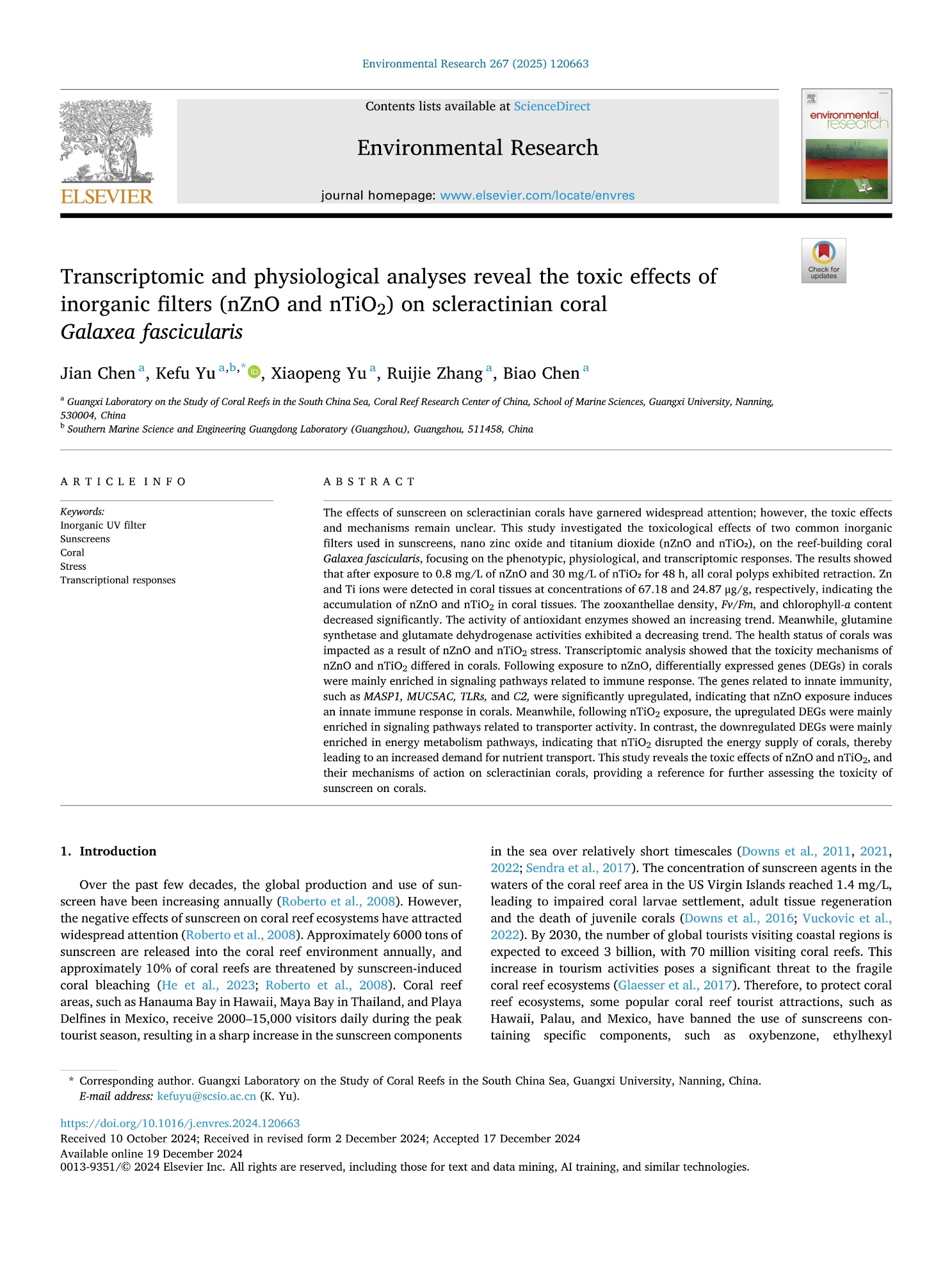 文章信息如下:Chen Jian, Yu Kefu,Yu Xiaopeng, Zhang Ruijie, Chen Biao. 2025. Transcriptomic and physiological analyses reveal the toxic effects of inorganic filters (nZnO and nTiO2) on scleractinian coral Galaxea fascicularis. Environmental Research. 267, 120663. https://doi.org/10.1016/j.envres.2024.120663.