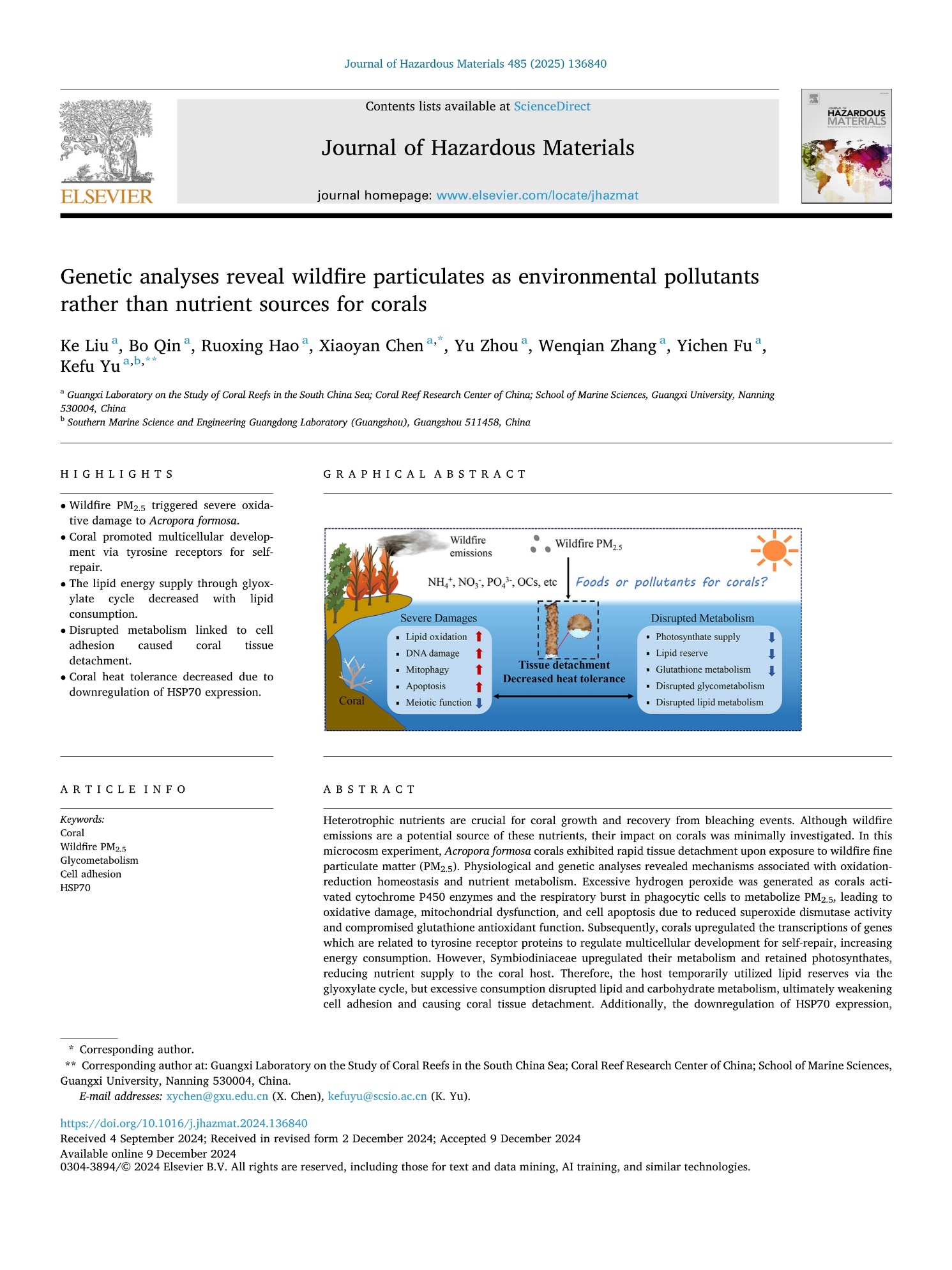 论文信息如下:Liu Ke , Qin Bo , Hao Ruoxing, Chen Xiaoyan, ZhouYu, ZhangWenqian, Fu Yichen, Yu Kefu. Genetic analyses reveal wildfire particulates as environmental pollutants rather than nutrient sources for corals. Journal of Hazardous Materials, 2025, 485: 136840.