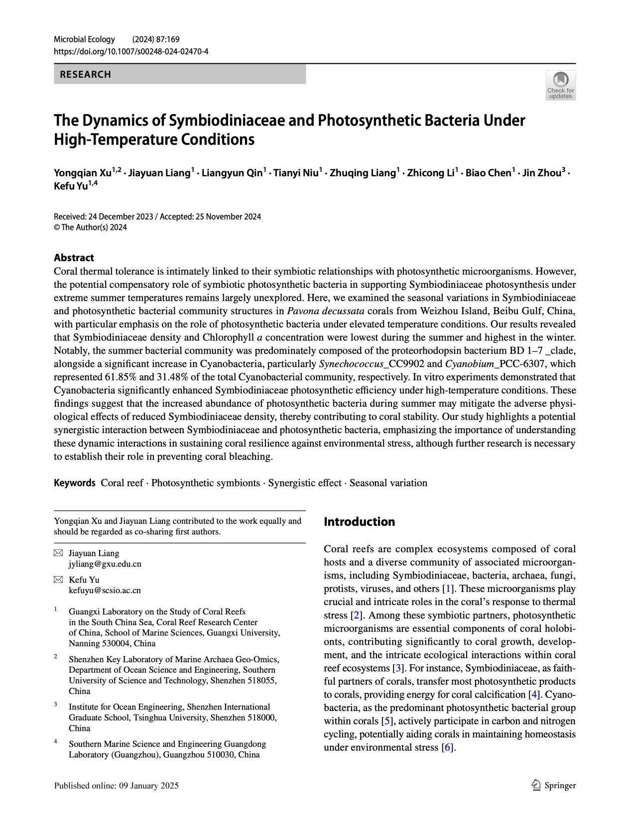 Xu Yongqian, Liang Jiayuan, Qin Liangyun, Niu Tianyi, Liang Zhuqing, Li Zhicong, Chen Biao, Zhou Jin, Yu Kefu. (2024). The Dynamics of Symbiodiniaceae and Photosynthetic Bacteria Under HighTemperature Conditions. Microbial Ecology, 87, 169. https://doi.org/10.1007/s00248-024-02470-4