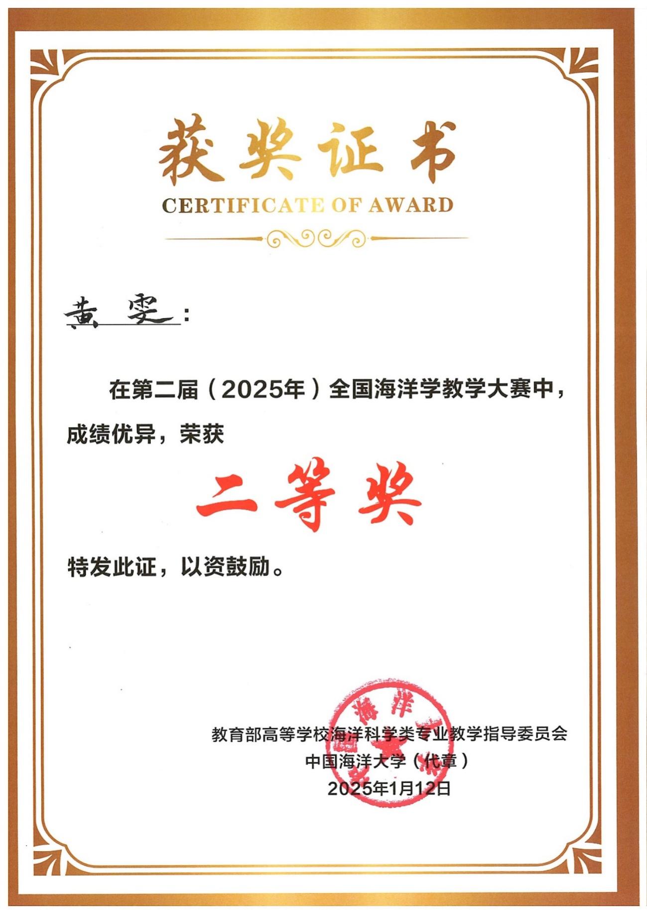 黄雯老师荣获二等奖