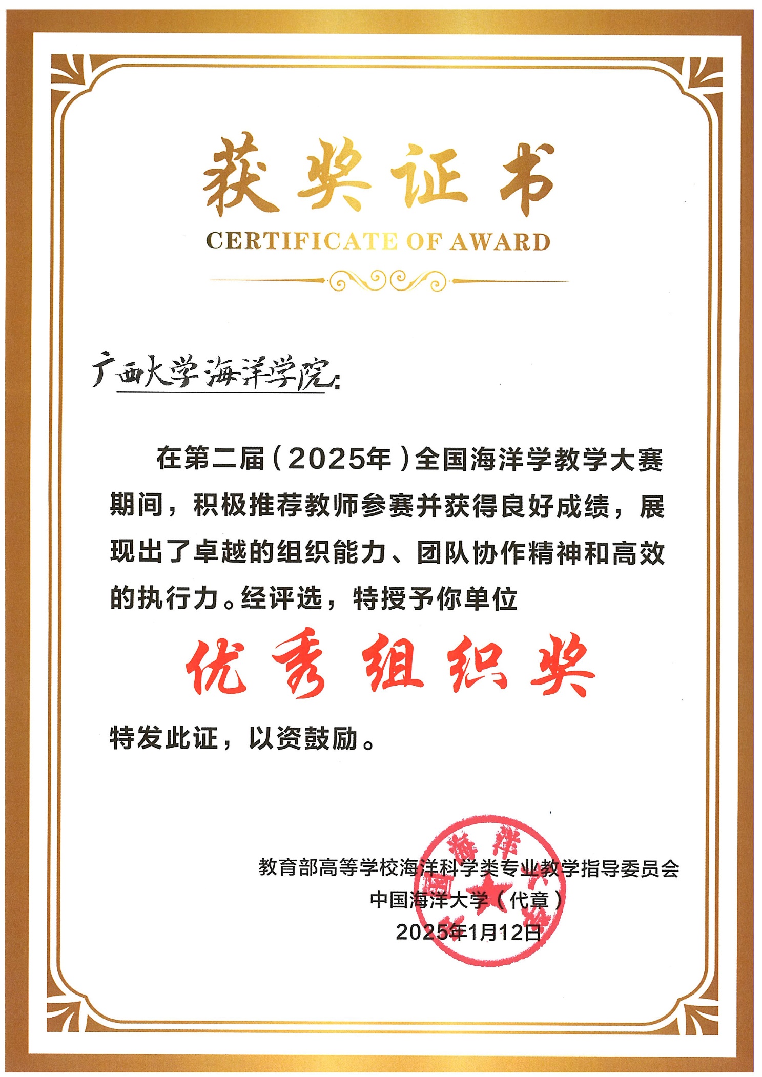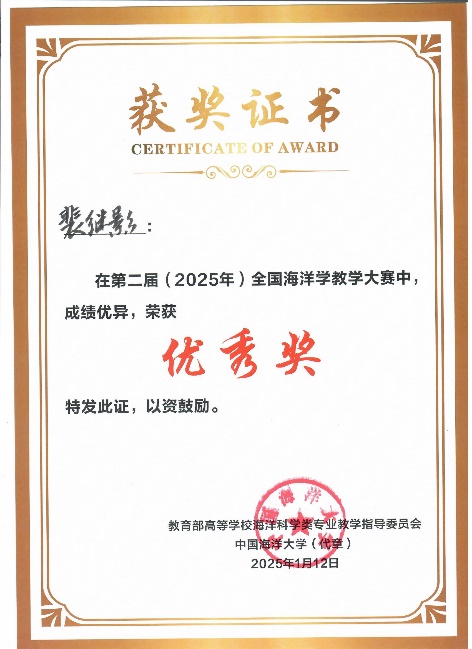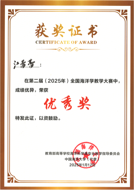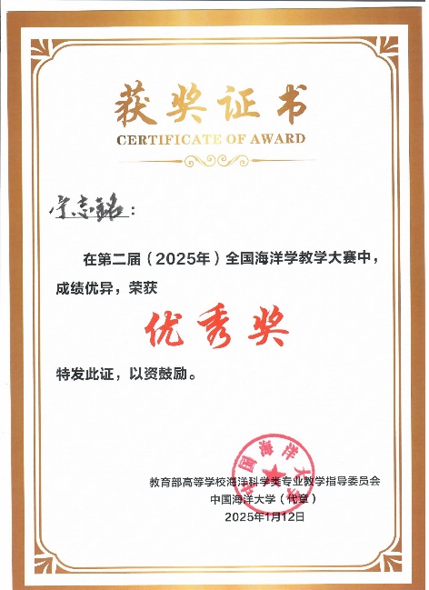 2025年1月11-12日,在广西大学举办的第二届(2025)全国海洋学教学大赛中,LETOU官网黄雯老师获得二等奖,裴继影、宁志铭和江蕾蕾分别获得优秀奖,LETOU官网荣获“优秀组织奖”。