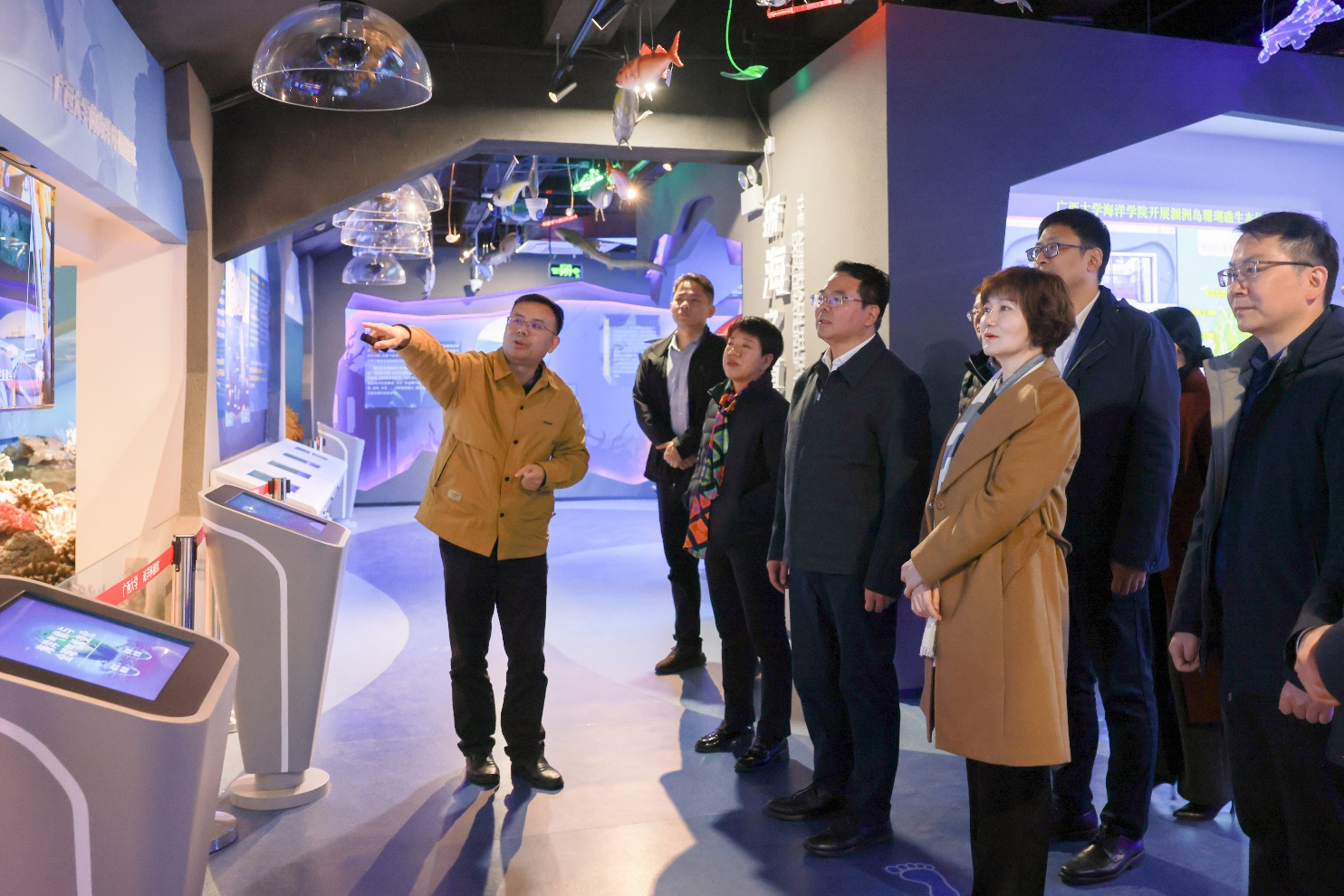 在珊瑚礁生态修复实验室,院长助理俞小鹏向调研组演示了珊瑚人工繁育技术,详细介绍了学院在珊瑚礁生态系统修复、海洋生物多样性保护等领域取得的突破性成果。调研组现场观摩了珊瑚礁修复动态监测平台及部分科研成果转化案例。