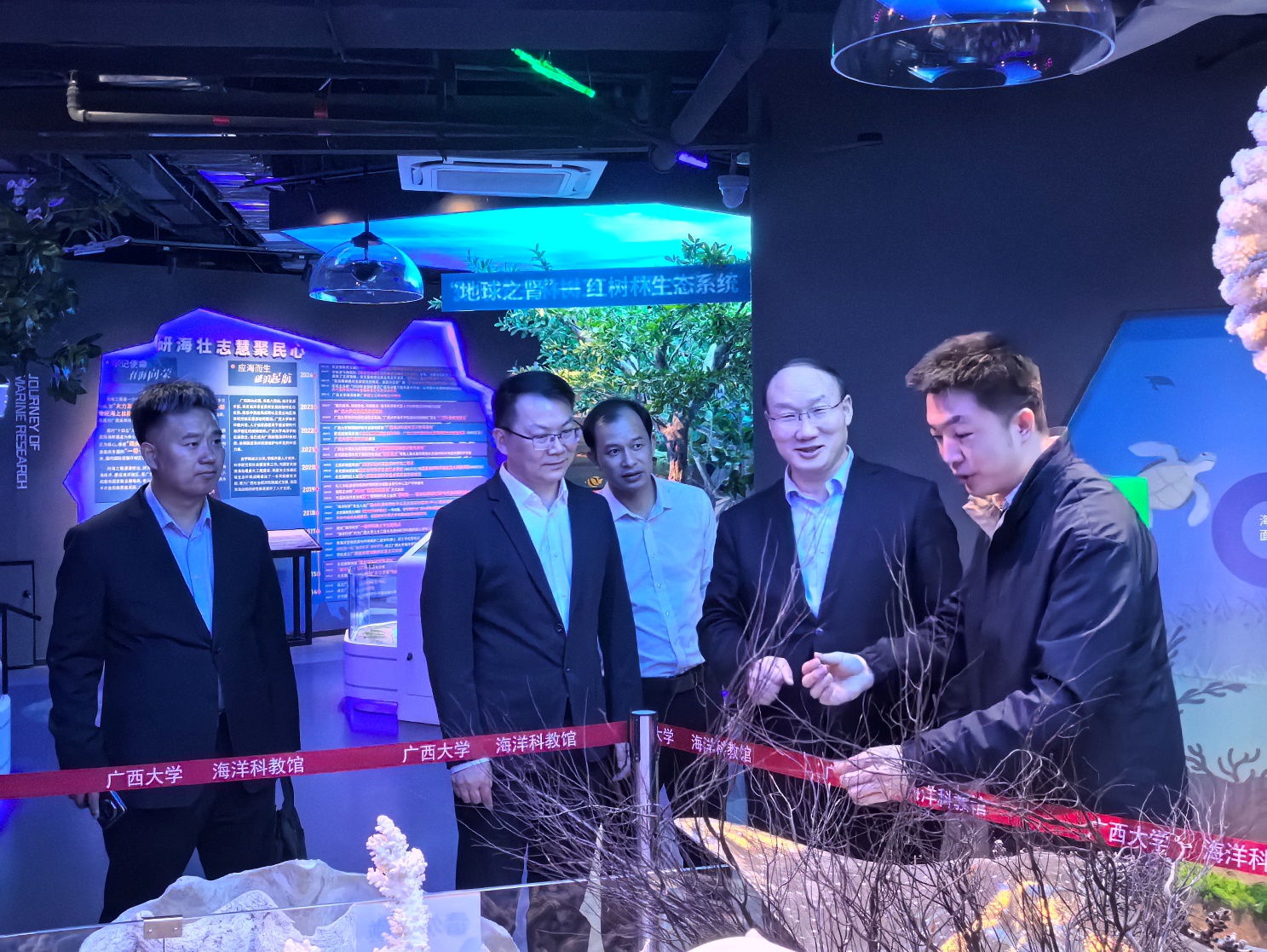 在海洋科教馆,张院士一行听取了LETOU官网院长助理俞小鹏关于LETOU官网在海洋资源开发、生态保护、深海探测技术等方面的科研成果汇报,实地察看了海洋生态模拟系统、深海探测装备模型、海洋生物多样性标本等核心展区,详细了解广西大学在珊瑚礁生态修复、深海传感器研发等领域的技术突破。张锁江详细询问了技术转化流程,对团队将化学工程原理与海洋生物学结合的创新路径表示高度赞赏。