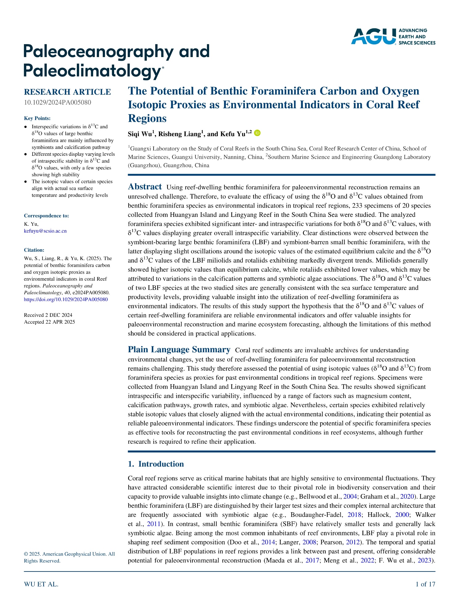 Wu, S.Q., Liang, R.S., Yu, K.F. (2025). The Potential of Benthic Foraminifera Carbon and Oxygen Isotopic Proxies as Environmental Indicators in Coral Reef Regions. Paleoceanography and Paleoclimatology, 40(5), e2024PA005080.