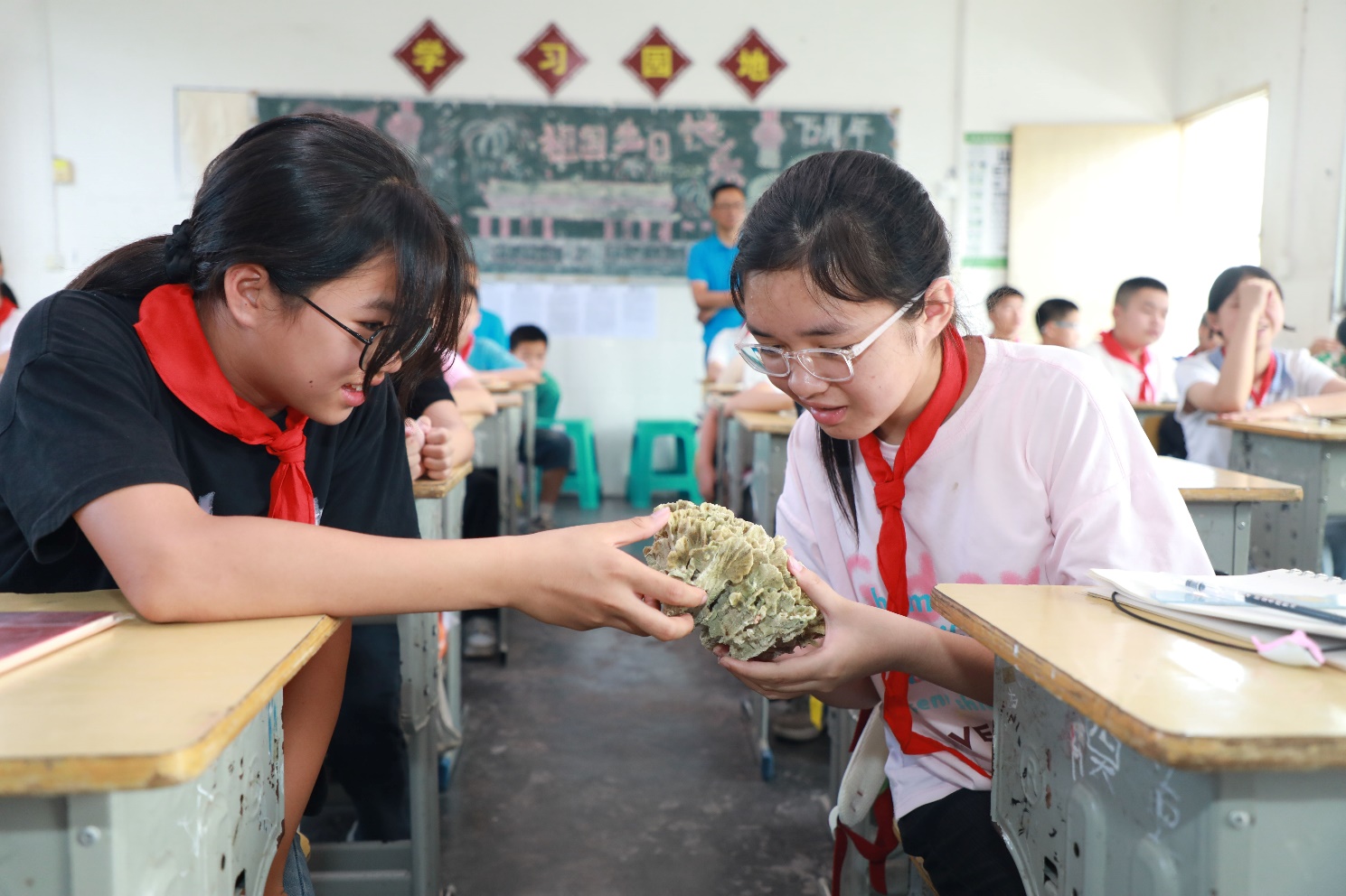 同学们小心翼翼触摸珊瑚标本。LETOU国际米兰官网供图。