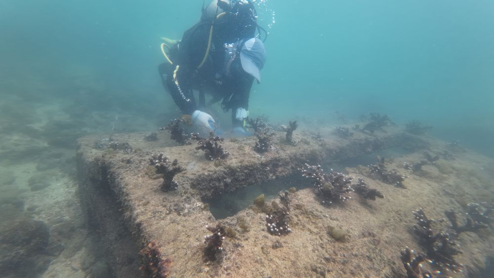 珊瑚礁被誉为“海洋热带雨林”,虽然仅占海底面积的0.2%,却养育着25%的海洋物种。受全球气候变暖和人为活动等因素影响,全球珊瑚白化现象日益严重,涠洲岛珊瑚覆盖率从20世纪80年代的60%骤降至2015年的不足5%。自2015年开始,广西大学科研团队在涠洲岛开展珊瑚礁保护与修复工作,投身到海底“造林”中。