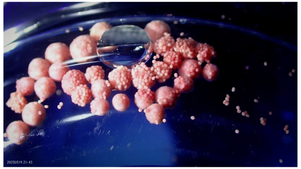 5月18日,团队依据珊瑚性腺发育监测及环境参数分析,精准锁定了涠洲岛珊瑚产卵的72小时“黄金窗口”。野外组潜入海底在修复区拍摄到珊瑚大量释放粉红色精卵团的珍贵画面;浮排组启动流水控制系统并采用生殖细胞促排技术收集到大量修复区种植的鹿角珊瑚等种类的精卵细胞;实验室组则争分夺秒进行精卵分离和冷冻保存,为建立我国珊瑚“生殖细胞库”提供技术支撑。