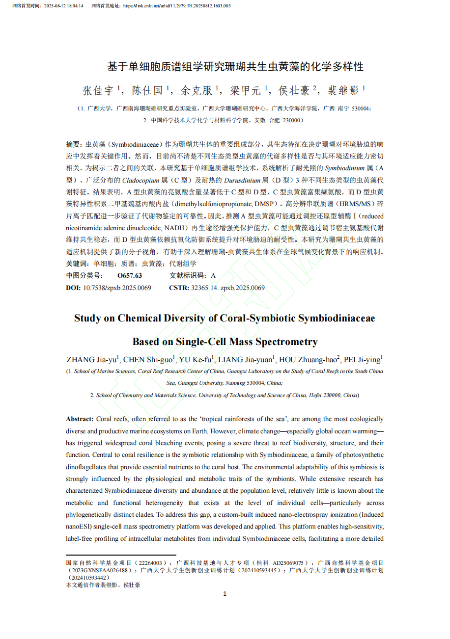 张佳宇,陈仕国,余克服,梁甲元,侯壮豪,裴继影.基于单细胞质谱组学研究珊瑚共生虫黄藻的化学多样性[J/OL].质谱学报.