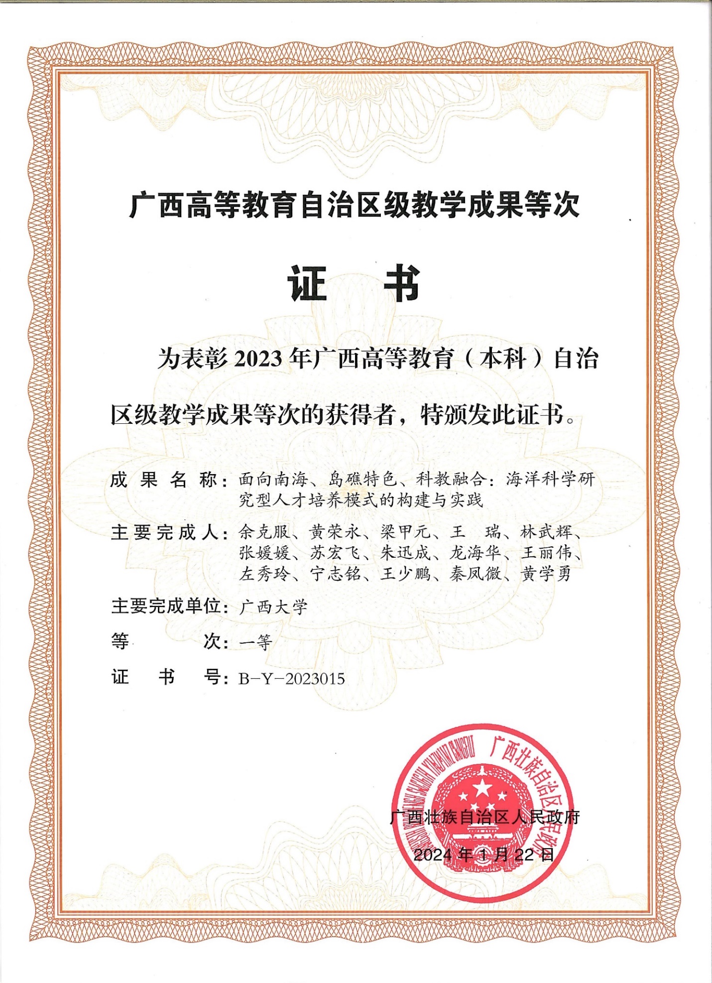 According to the “Notice the Education Department of Guangxi Zhuang Autonomous Region on the Announcement of the Results of the 2023 Guangxi Higher Education Region-level Teaching Achievement Assessment”, The project Integration of Scientific Research and Education in Marine Science for the SCS and Island Coral Reefs: Constructing and Practising a Model for Cultivating Marine Science Research Talents led by Professor Yu Kefu and other team members of our college won the first prize in the “undergraduate teaching achievement” group in 2023.